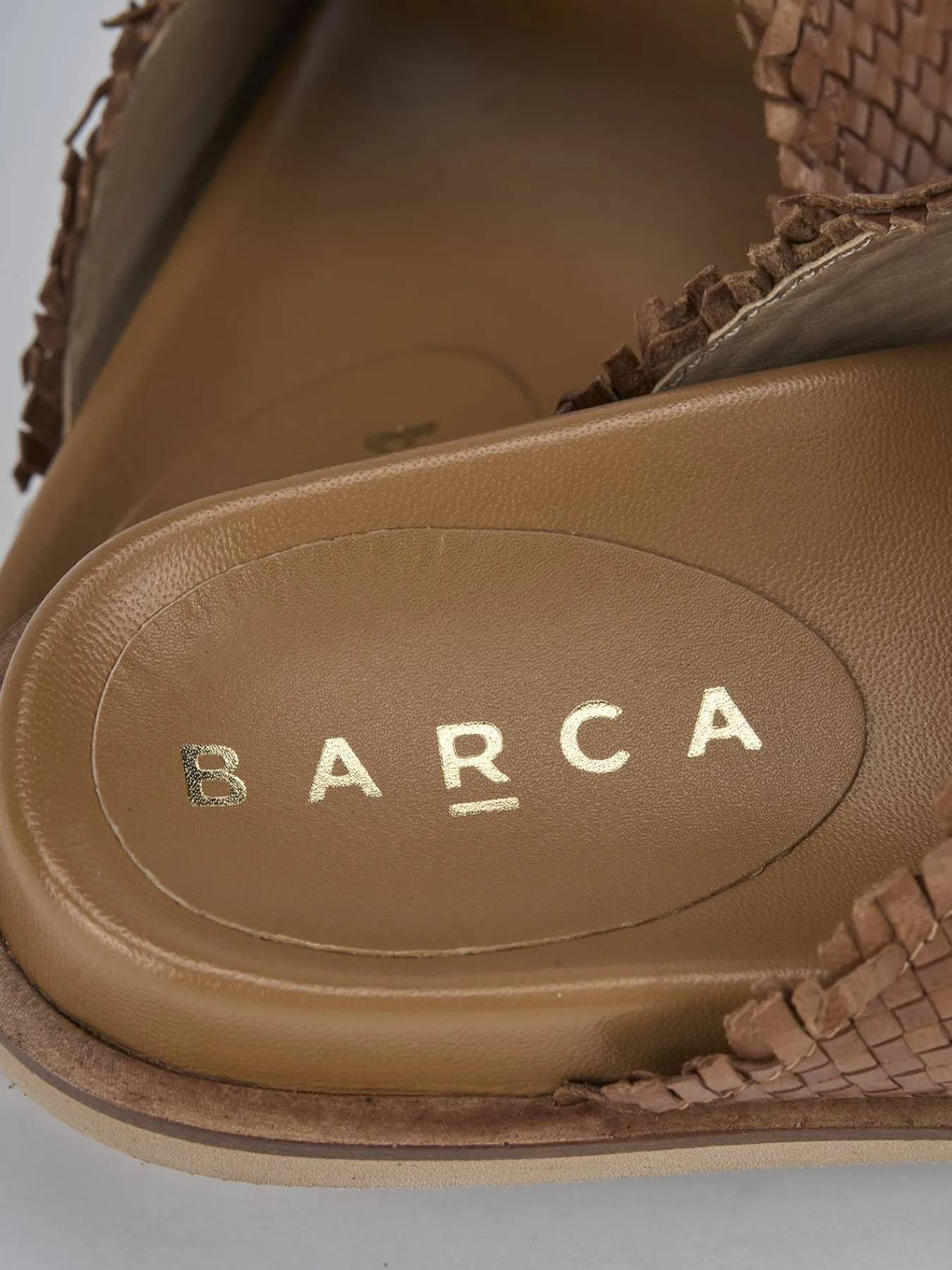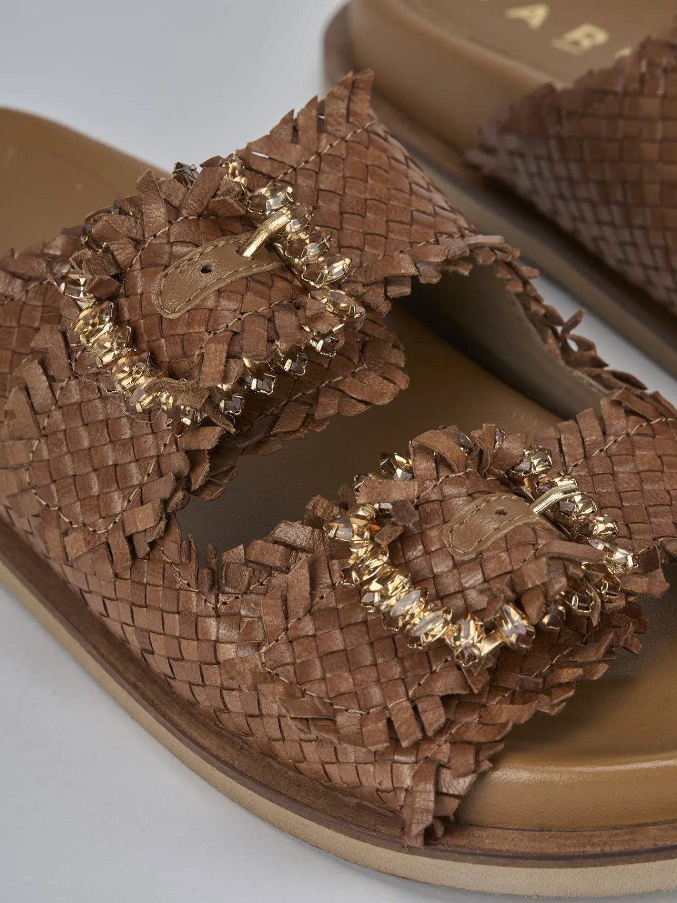 La tomaia è realizzata in morbida pelle finemente intrecciata, arricchita da due fasce con preziosi accessori fibbia strass.
