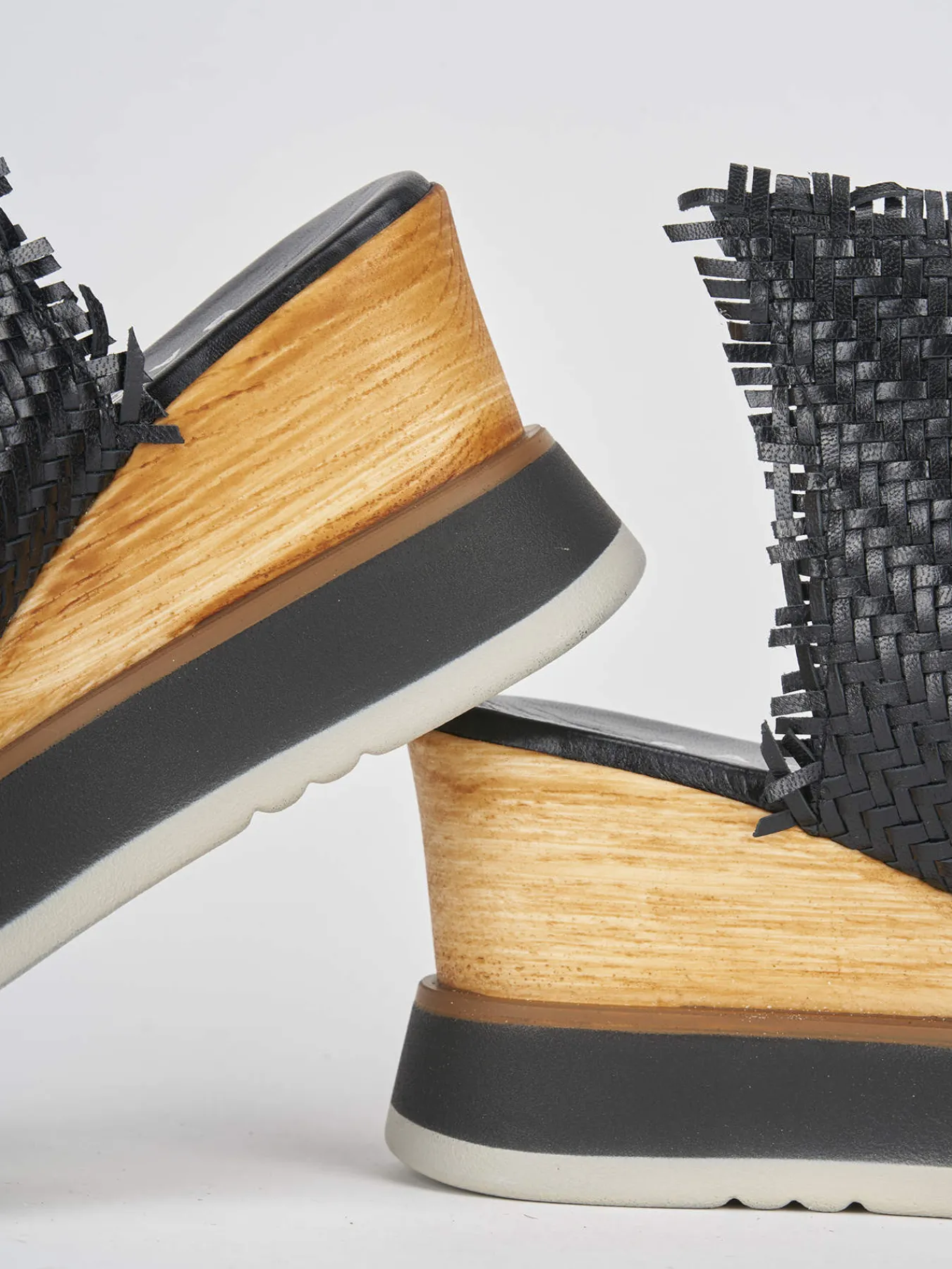 ciabatta zeppa 8 cm fondo in leggera gomma e soletto interno in vera pelle. tomaia in morbida pelle intrecciata, fascia unica con taglio geometrico e plateau 3 cm davanti per un look cool.
