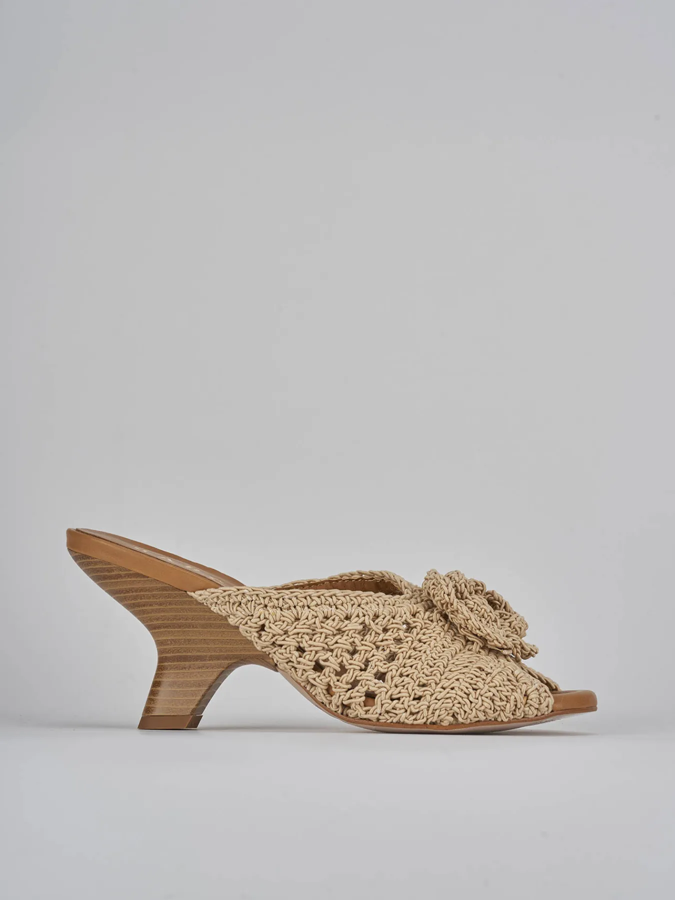 Ciabatta tacco 8 cm fondo in cuoio e soletto interno in vera pelle. tomaia in morbido tessuto crochet, punta tonda, stile uncinetto, fascia unica con accessorio. Tacco pieno effetto legno per un look glamour e adatto alle occasioni più speciali.