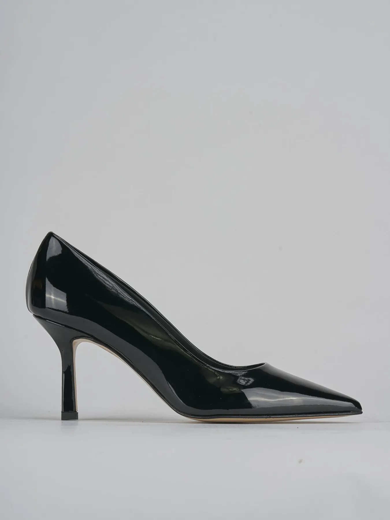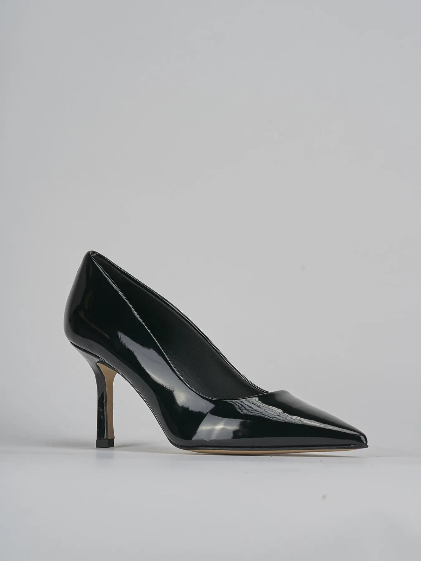 La tomaia in morbida pelle effetto verniciato dona un look sofisticato e moderno, mentre la punta sfilata e lo scollo squadrato aggiungono un dettaglio chic e ricercato.
