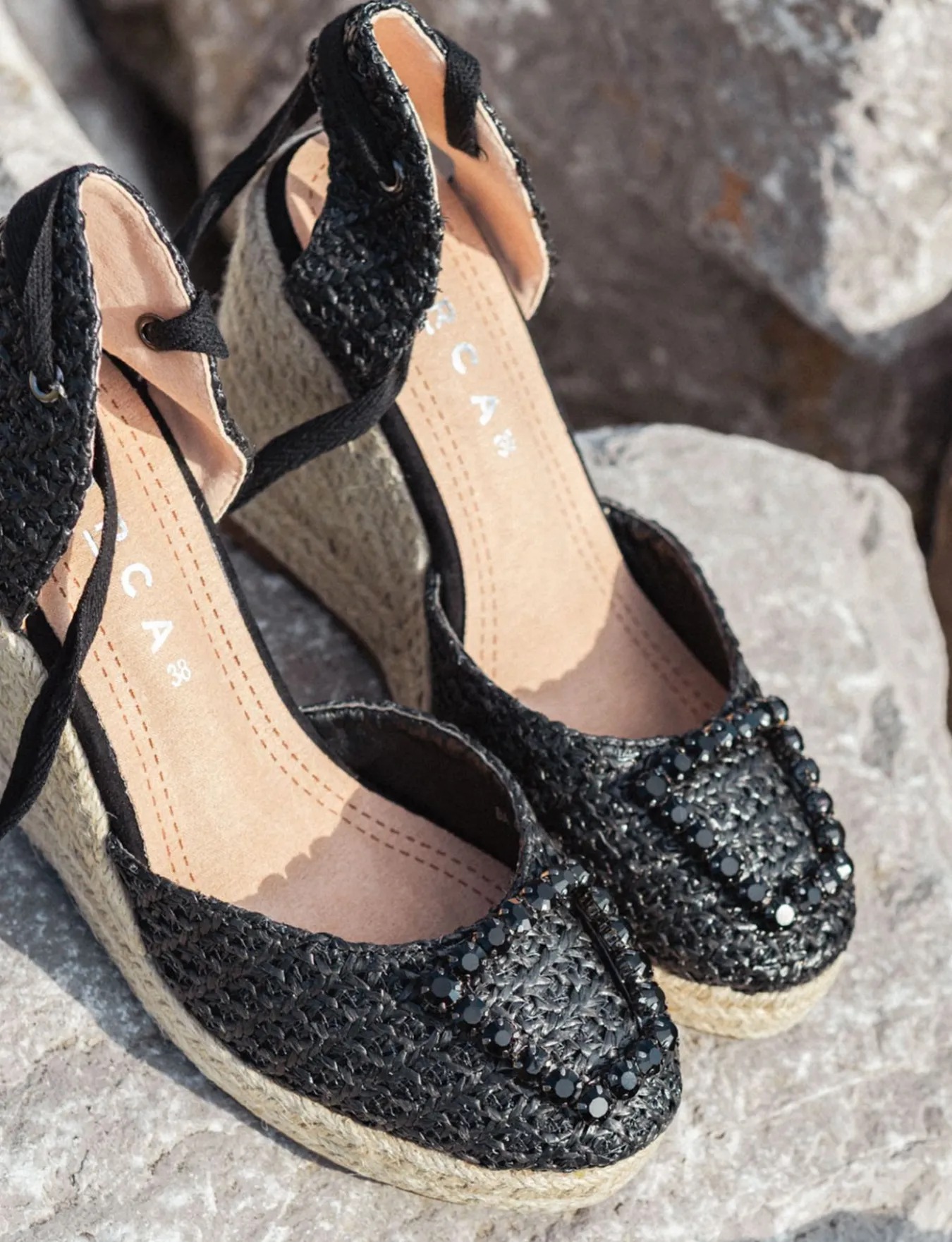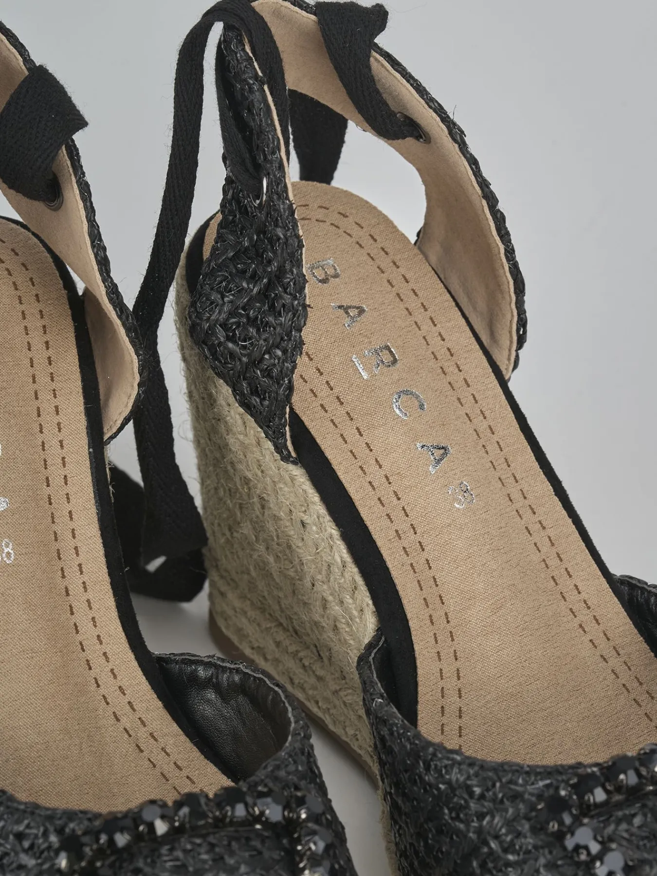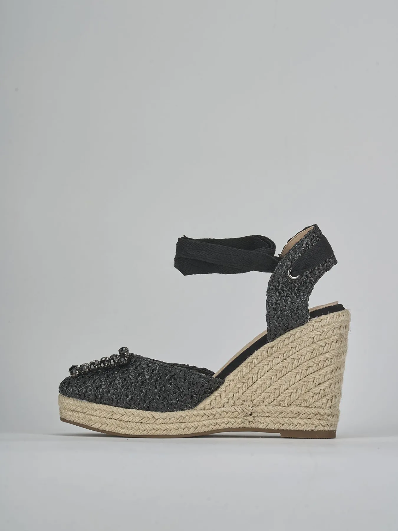 Espadrillas zeppa 8 cm fondo in gomma e soletto interno in vera pelle. Tomaia in morbida pelle coperta da rafia, punta affusolata, accessorio con strass e chiusura alla schiava. Modello passepartout con un twist elegante.