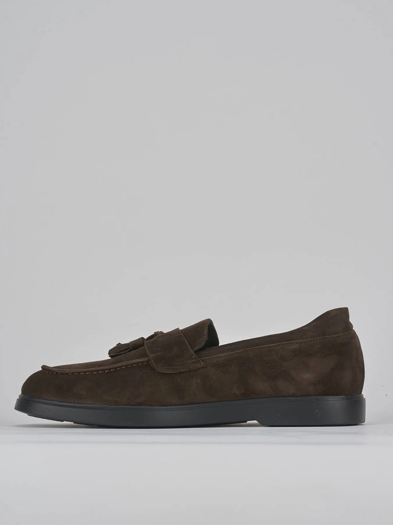 Realizzati in morbido camoscio, questi mocassini offrono una punta leggermente squadrata, impreziosita da cuciture a mano a vista e nappine eleganti.
