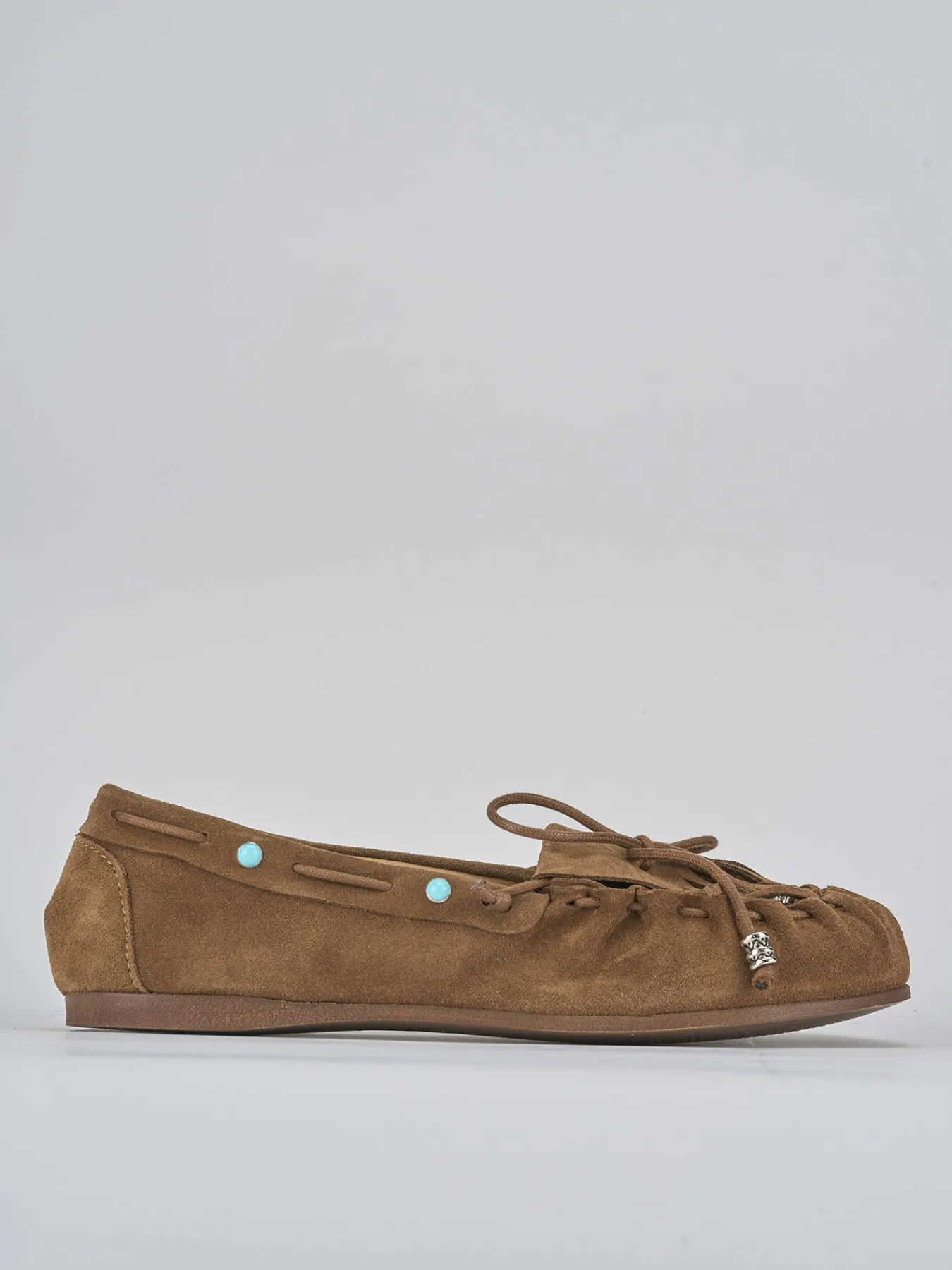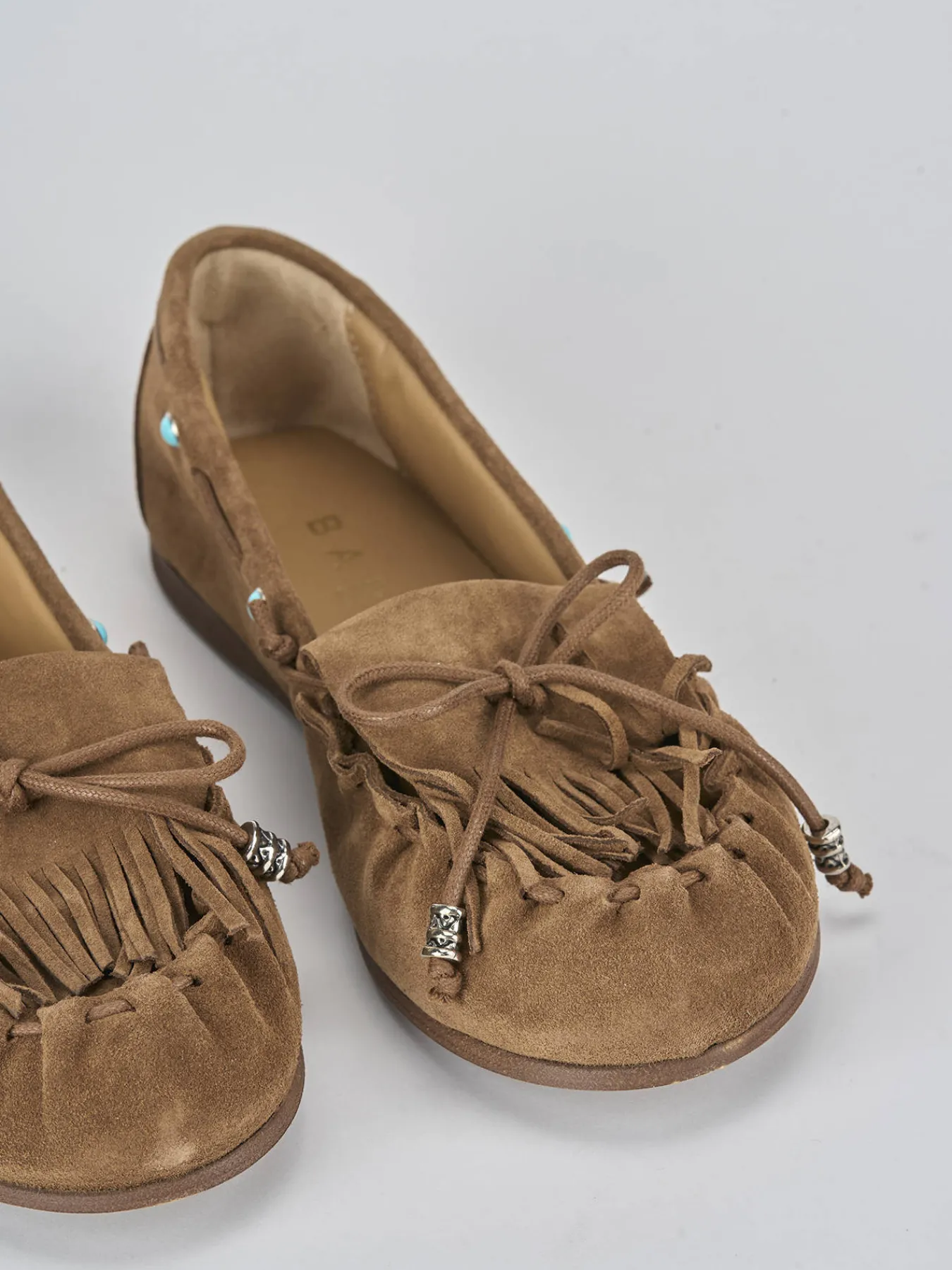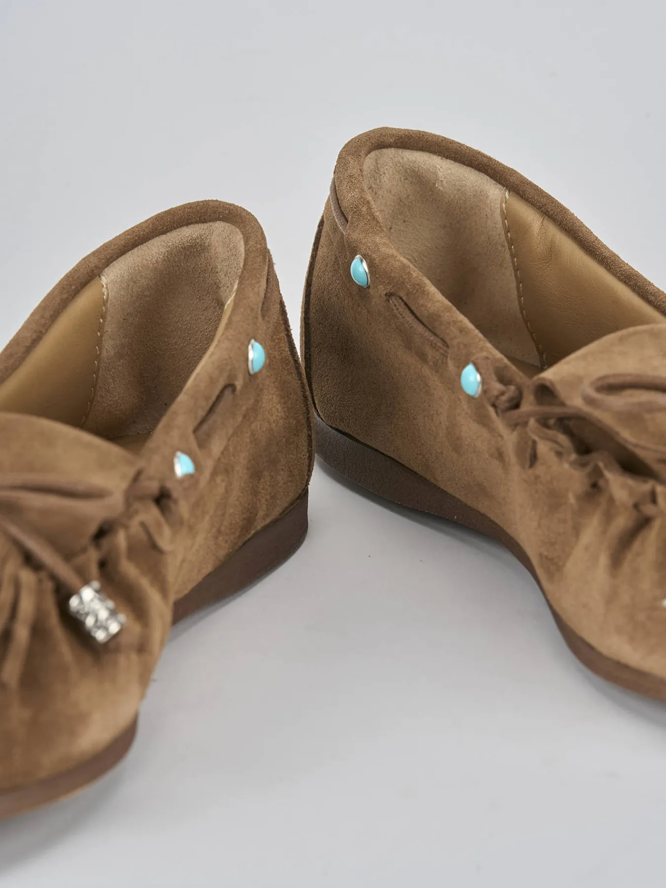 La tomaia è realizzata in morbida pelle scamosciata, arricchita da un elegante fiocco con frange e dettagli in metallo a contrasto, per un tocco di classe in più.