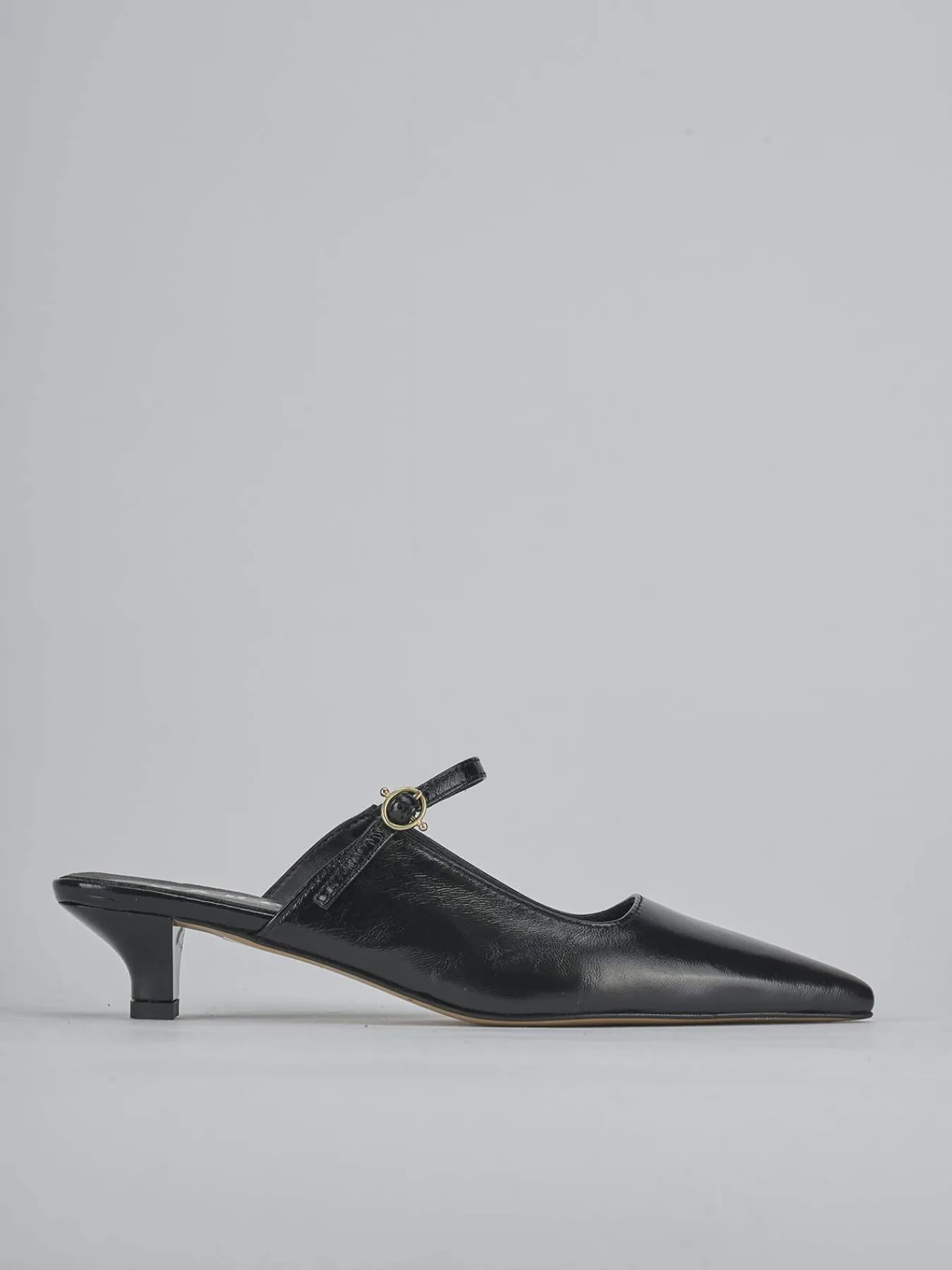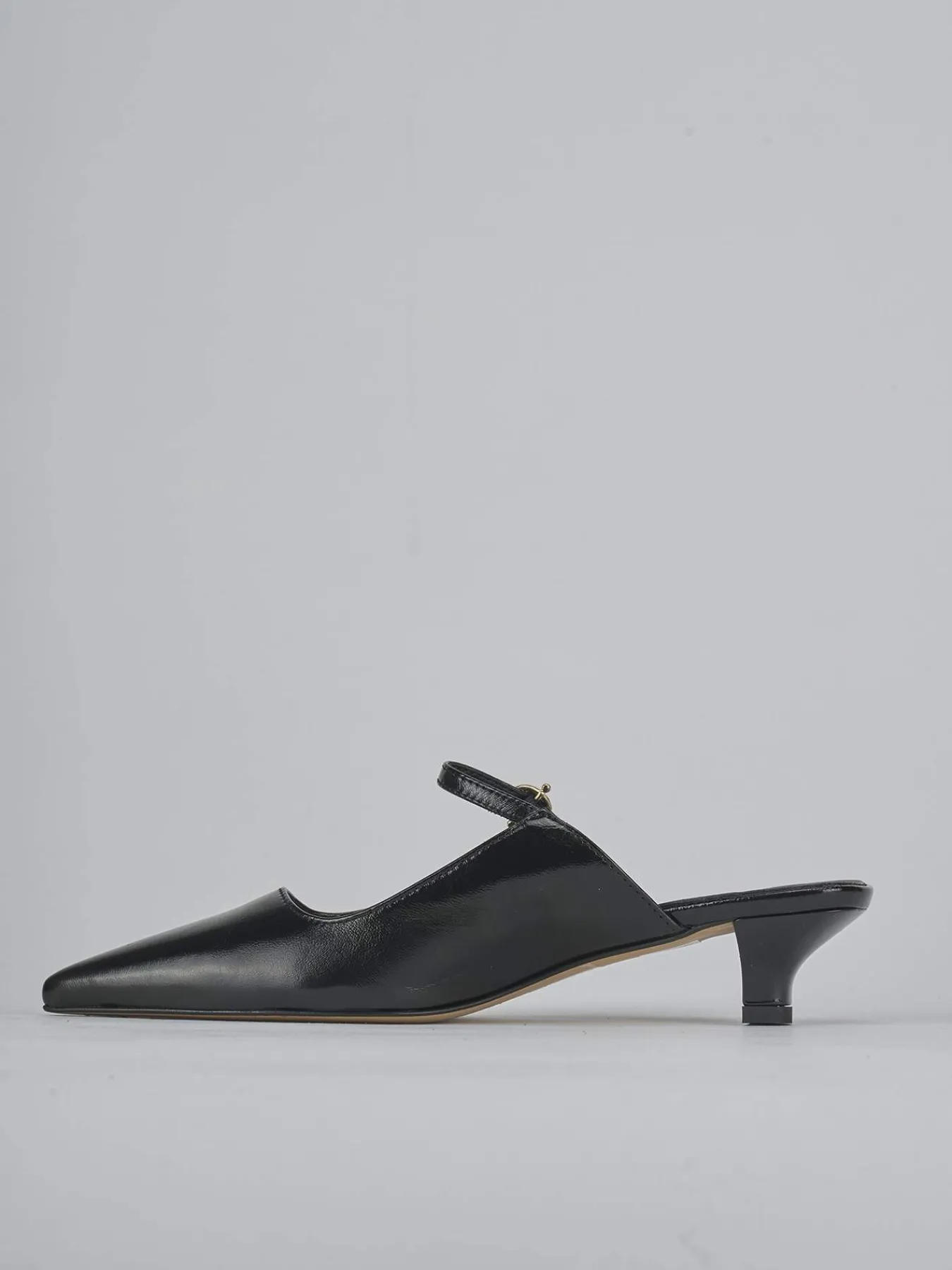 Sabot tacco 3 cm fondo in leggerissima gomma e soletto interno in vera pelle. Tomaia in morbida pelle effetto verniciato, punta sfilata, scollo squadrato, cuciture a mano, cinturino con fibbia regolabile e tacco rocchetto. Perfetto per qualsiasi occasione.