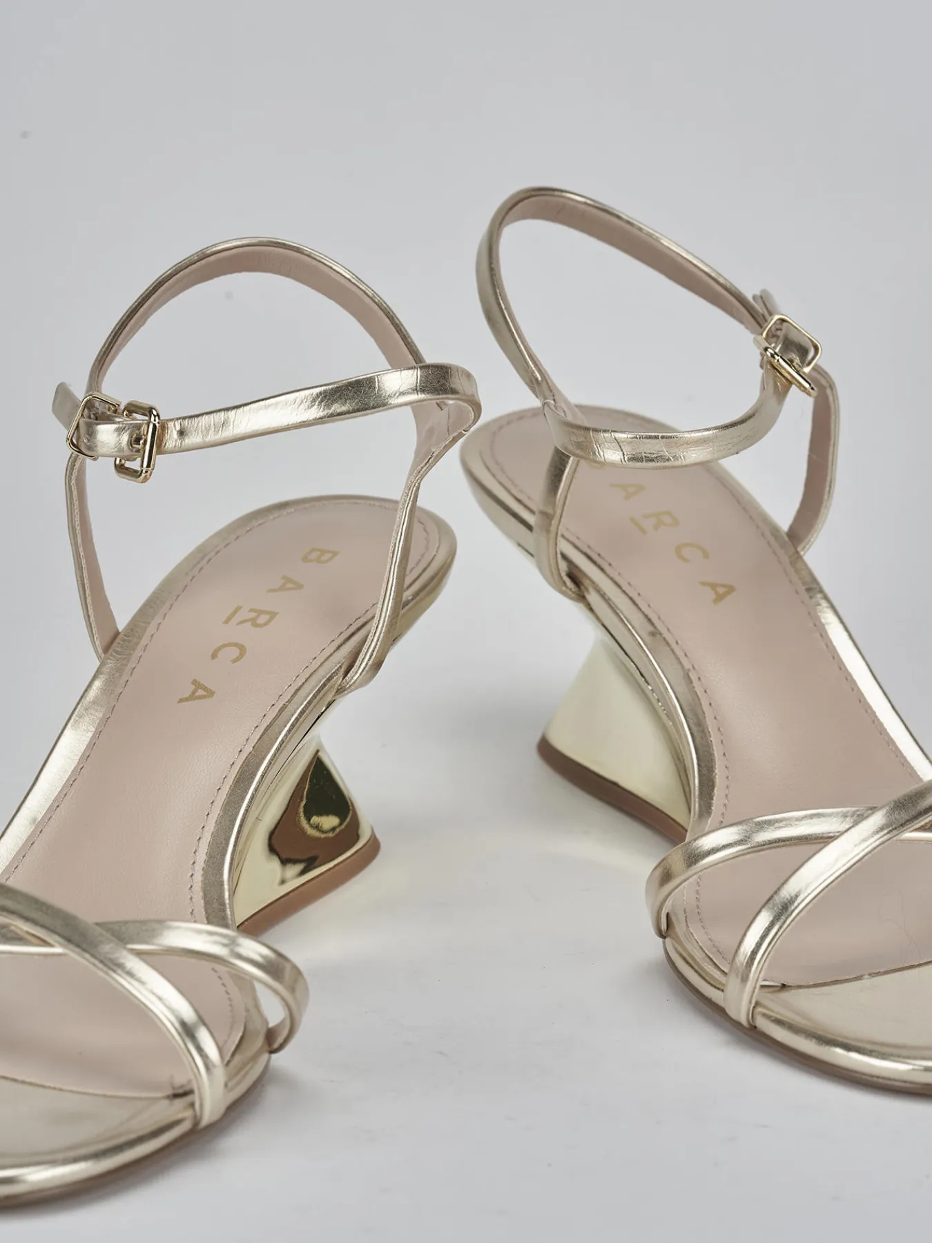 Sandalo tacco 5 cm fondo in leggerissima gomma e soletto interno in vera pelle. tomaia in morbida pelle, punta affusolata, due fasce incrociate, cinturino in caviglia con fibbia regolabile. Nuovissimo tacco geometrico in ABS per un look super cool.