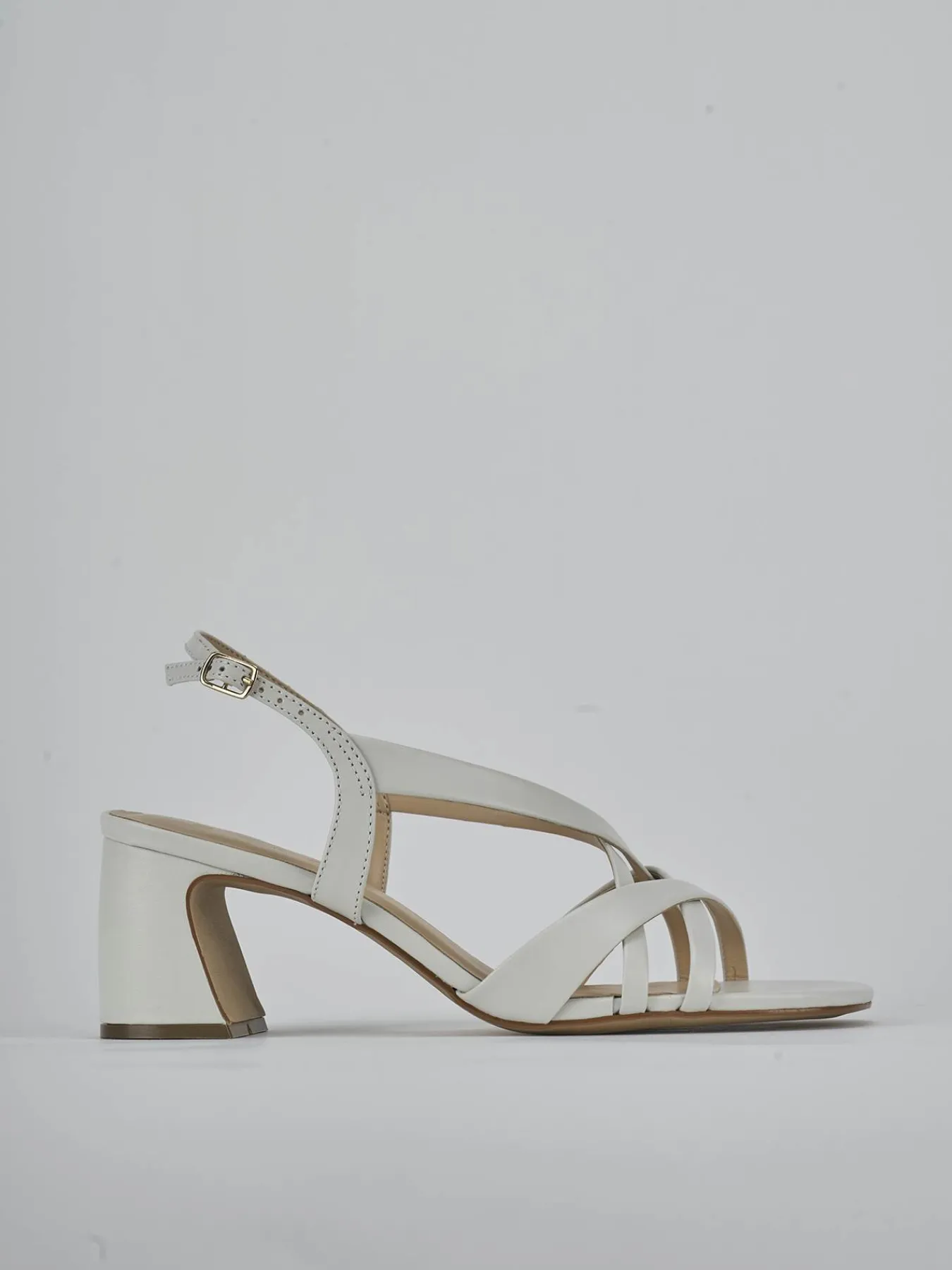 Sandalo tacco 6 cm fondo in leggerissima gomma e soletto interno in vera pelle. Tomaia in morbida pelle, punta leggermente squadrata, fascette incrociate e cinturino con fibbia regolabile e tacco grosso. Dal design che dura nel tempo, perfetto con qualsiasi outfit.