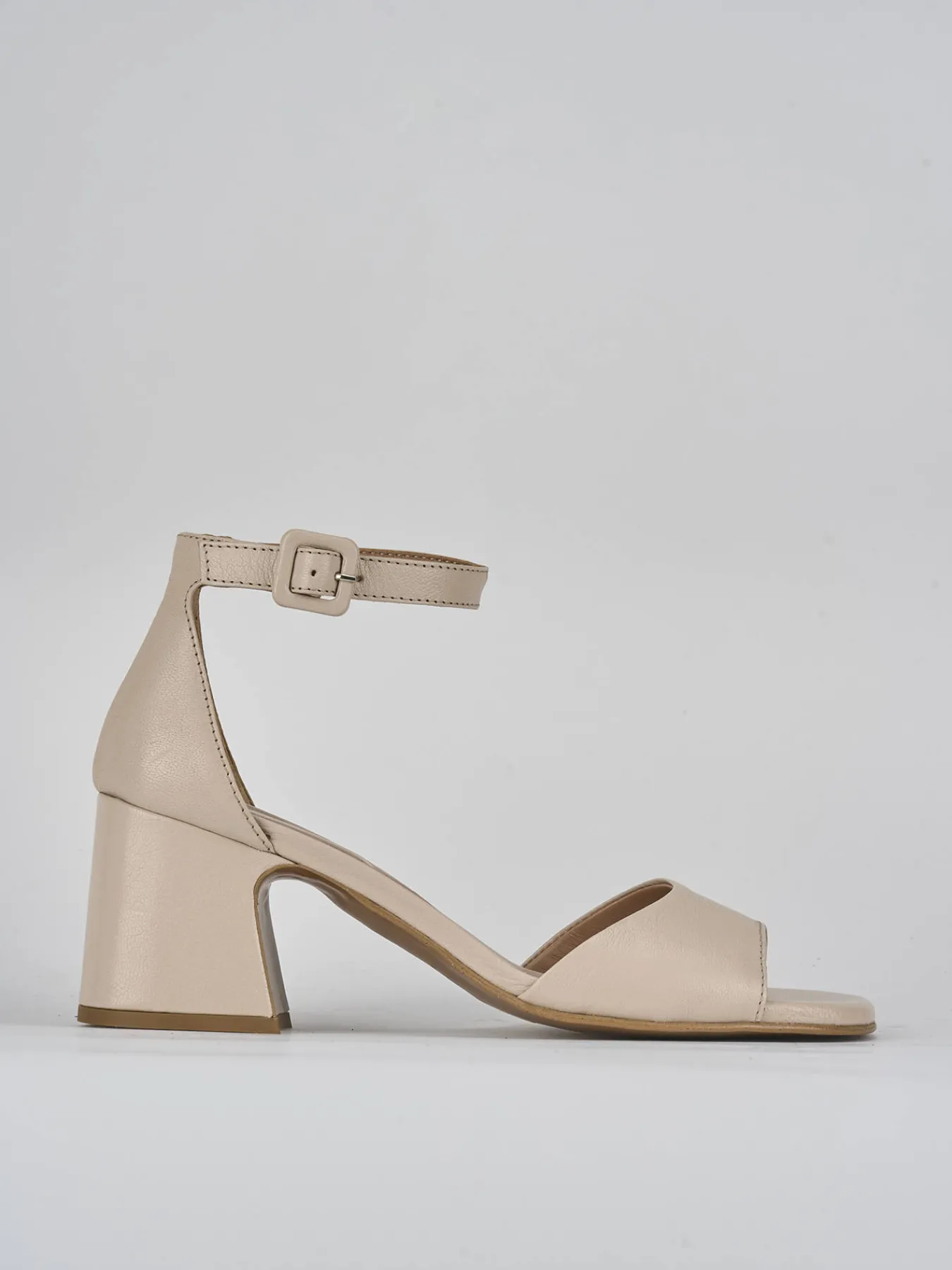 Sandalo tacco 7 cm fondo in cuoio e soletto interno in vera pelle. Tomaia in morbida pelle, punta leggermente squadrata, fascia unica in punta, cinturino in caviglia con fibbia regolabile e nuovissimo tacco. Perfetto sia con degli shorts che con un vestito midi floreale.