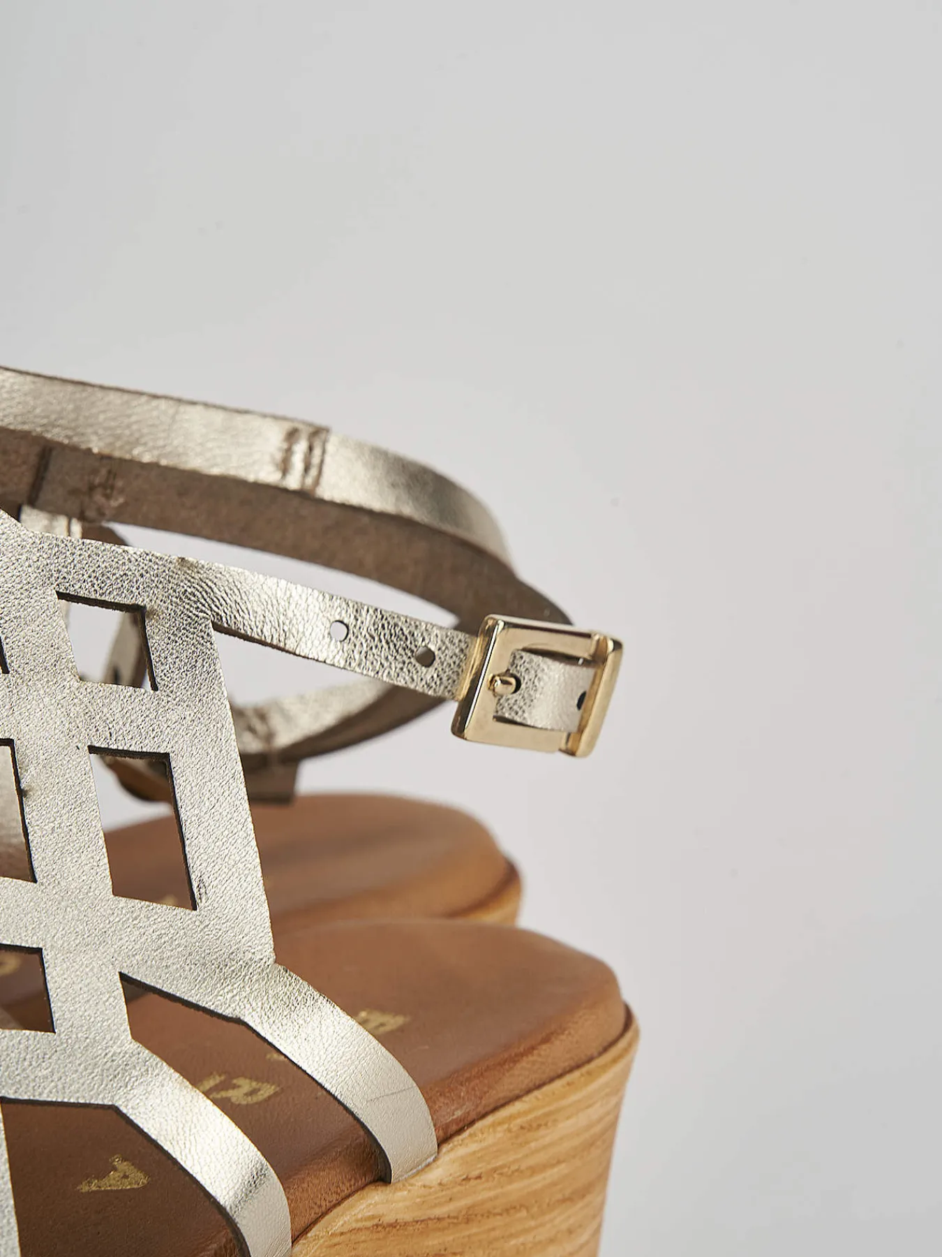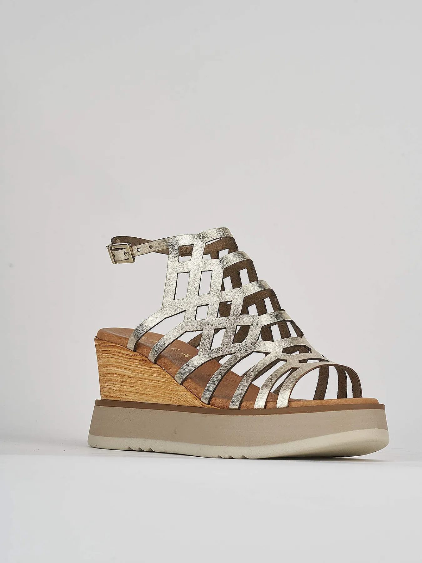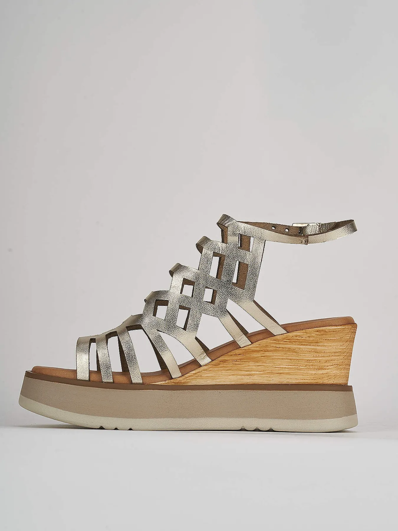 sandalo zeppa 7 cm fondo in leggerissima gomma e soletto interno in vera pelle. tomaia in morbida pelle laminata, fasce geometriche laserate a ragnetto e cinturino regolabile. plateau 3 cm per un comfort senza eguali.