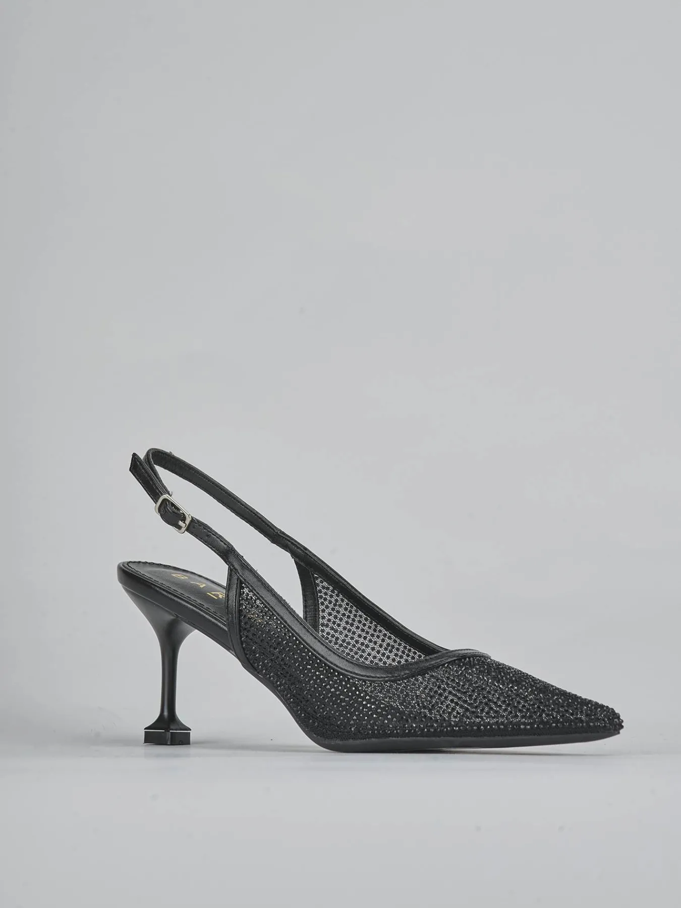 Slingback tacco 6 cm fondo in leggera gomma e soletto interno in vera pelle. Tomaia in morbida pelle foderata in tessuto, punta sfilata, rete semitrasparente, strass, bordo a rinforzo ton sur ton, cinturino con fibbia regolabile e tacco rocchetto. Perfetto per qualsiasi sia la tua occasione.