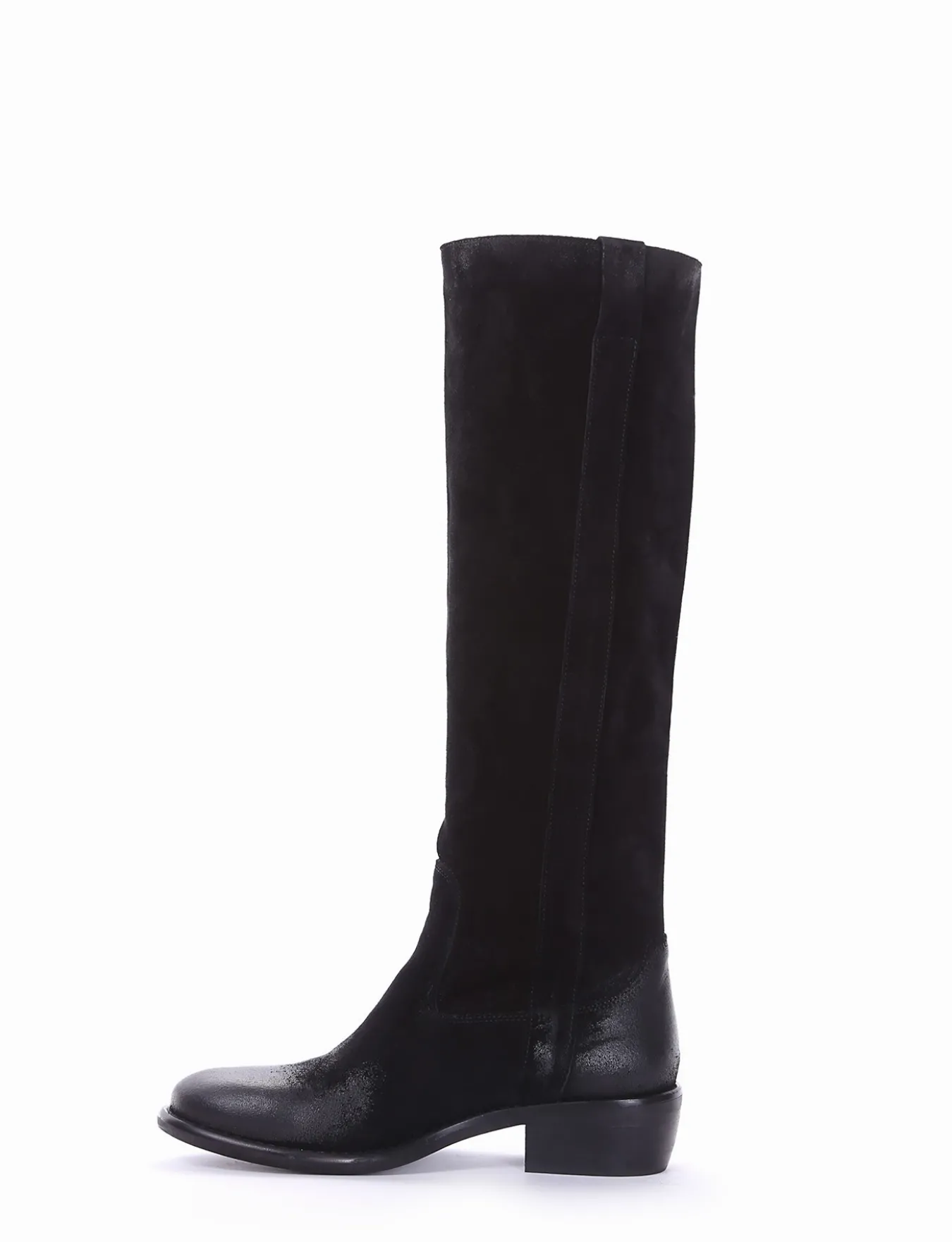 stivale texano tacco 2 cm, fondo in cuoio e soletto interno in vera pelle. Tomaia in morbidissimo camoscio lavorato vintage, punta arrotondata e gambale a tubo sotto il ginocchio.