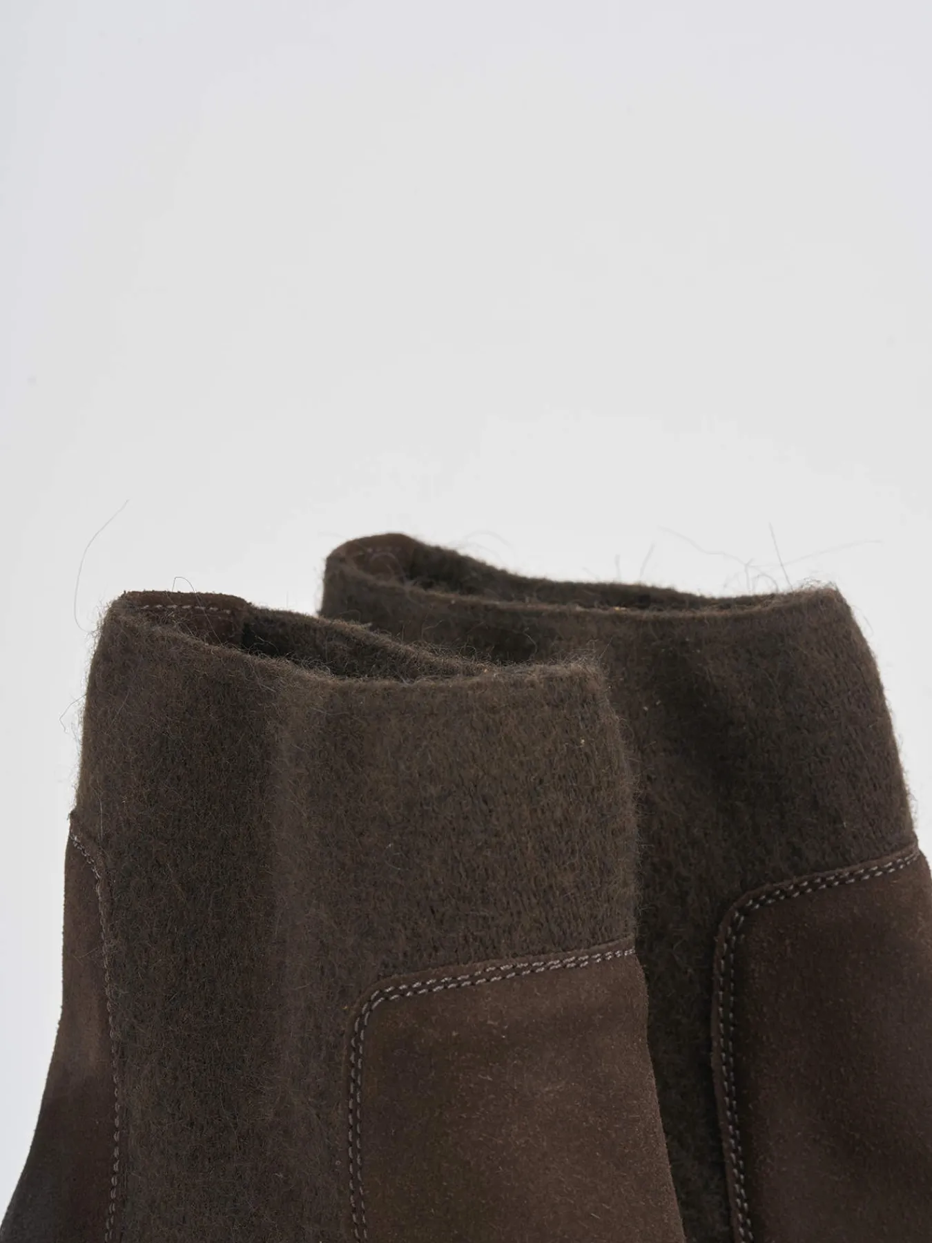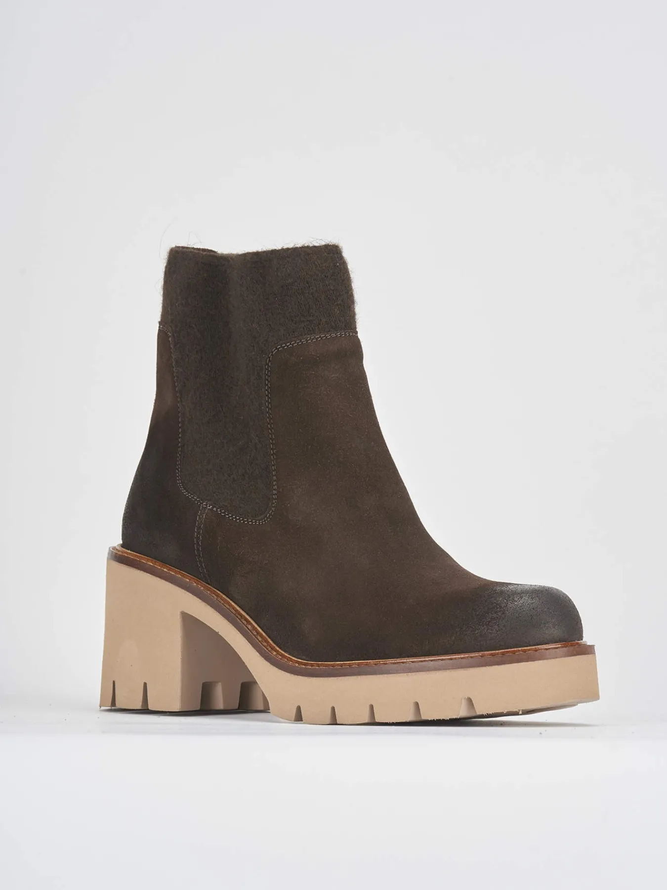 Tronchetto tacco 5 cm fondo in gomma e soletto interno in vera pelle. Tomaia in morbido camoscio, punta tonda, plateau di 1 cm sulla parte anteriore, cuciture visibili e lati elasticizzati con tessuto in lana e tacco grosso in contrasto con la tomaia per un look cool.
