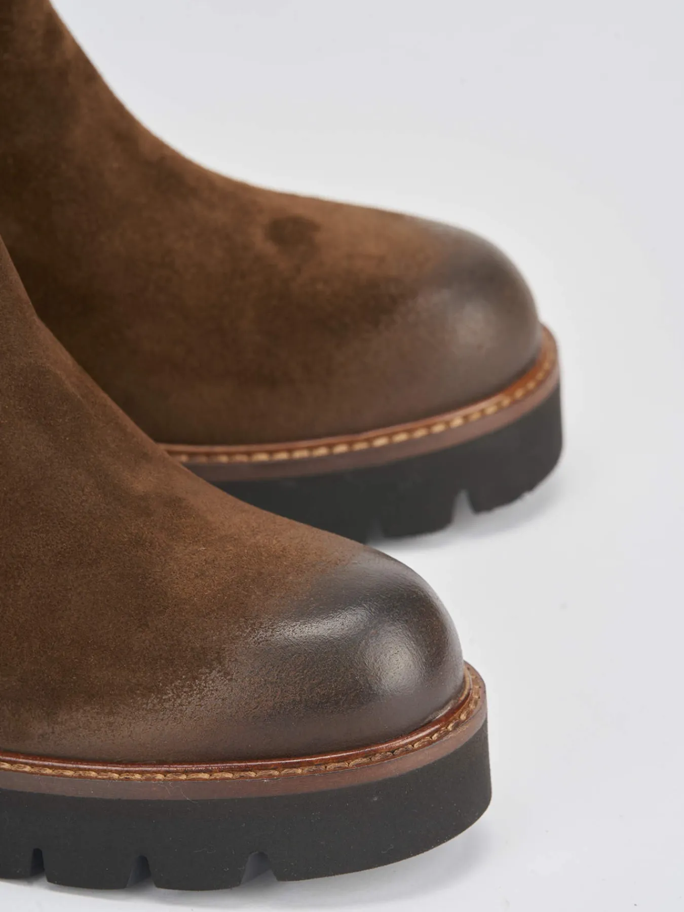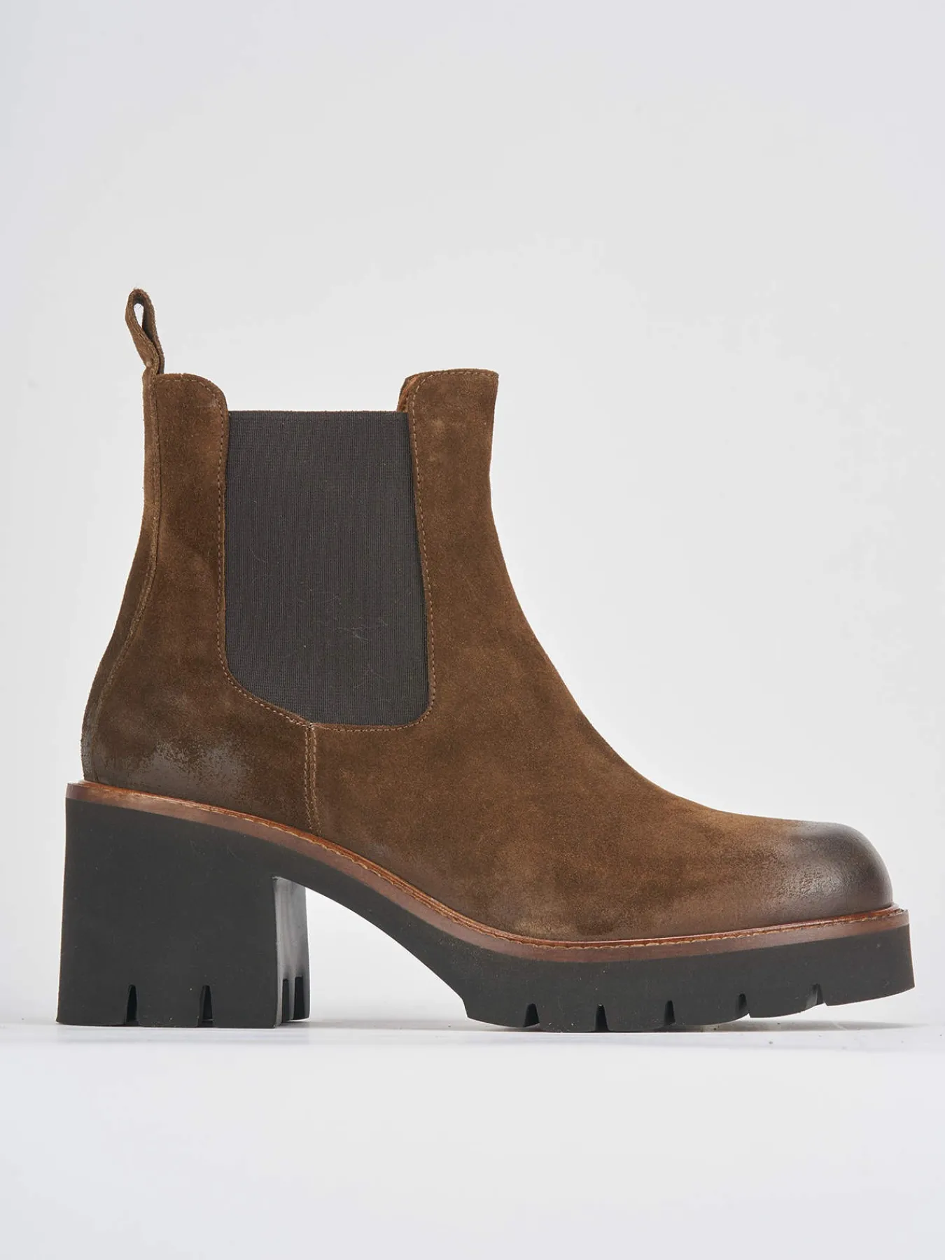 Tronchetto tacco 6 cm fondo in gomma e soletto interno in vera pelle. Tomaia in morbido camoscio, punta tonda, tessuto elasticizzato ai lati e fondo extralight per un look cool. Tacco grosso e plateau di 1 cm sulla parte anteriore per una camminata sicura.