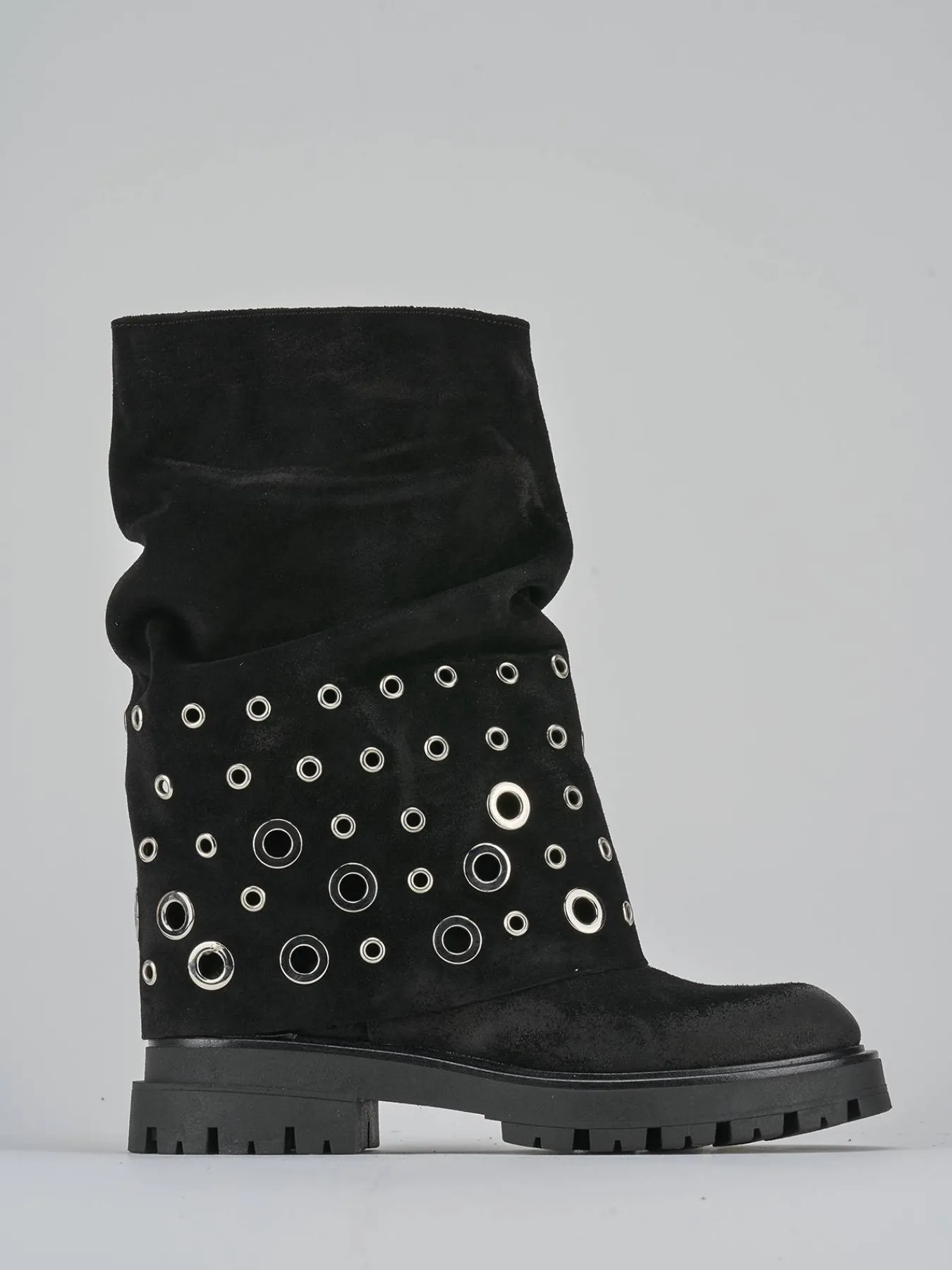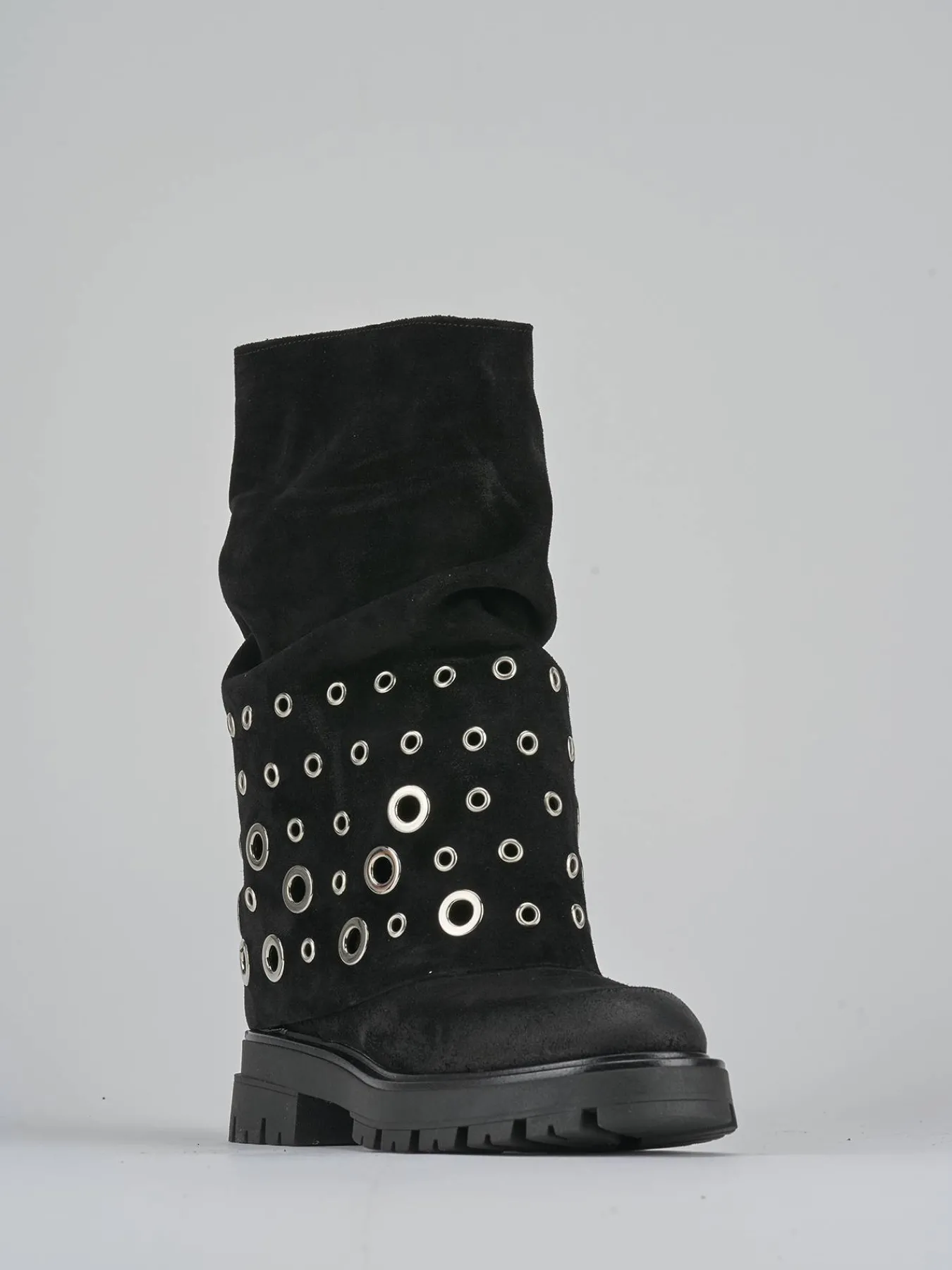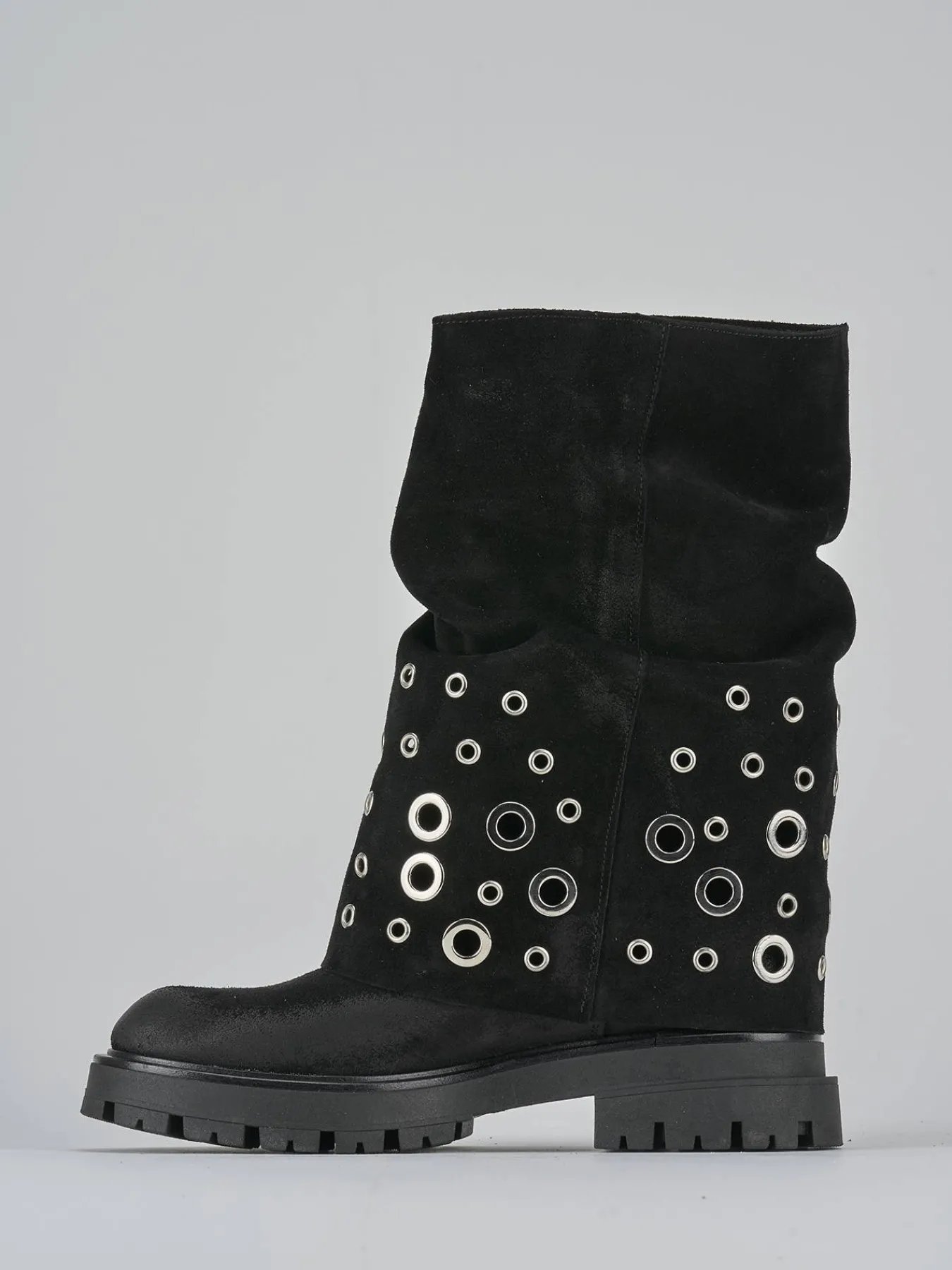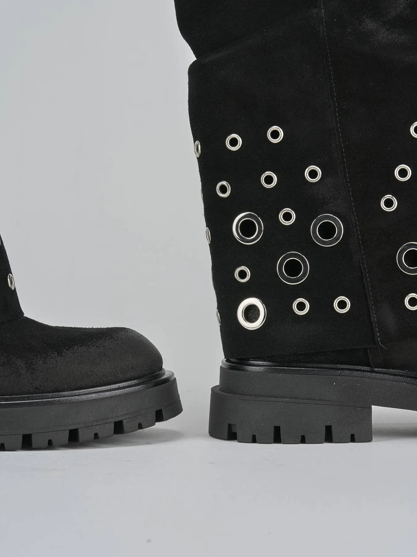 Il gambale a tre quarti del polpaccio è arricchito da un risvolto con borchie in metallo, aggiungendo un tocco di grinta al tuo outfit.