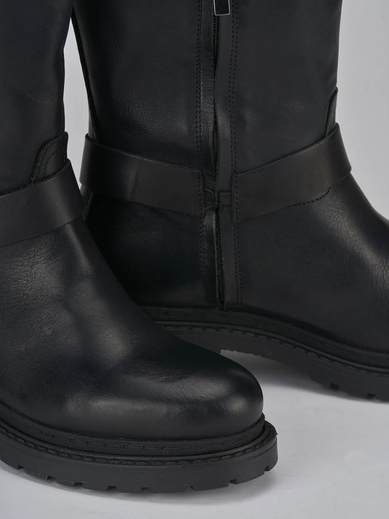 Stivale tacco 2 cm fondo in gomma e soletto interno in vera pelle. Tomaia in morbida pelle, punta arrotondata, anello e fascette decorative ad altezza caviglia per un look cool. Altezza gambale fino a sotto il ginocchio.