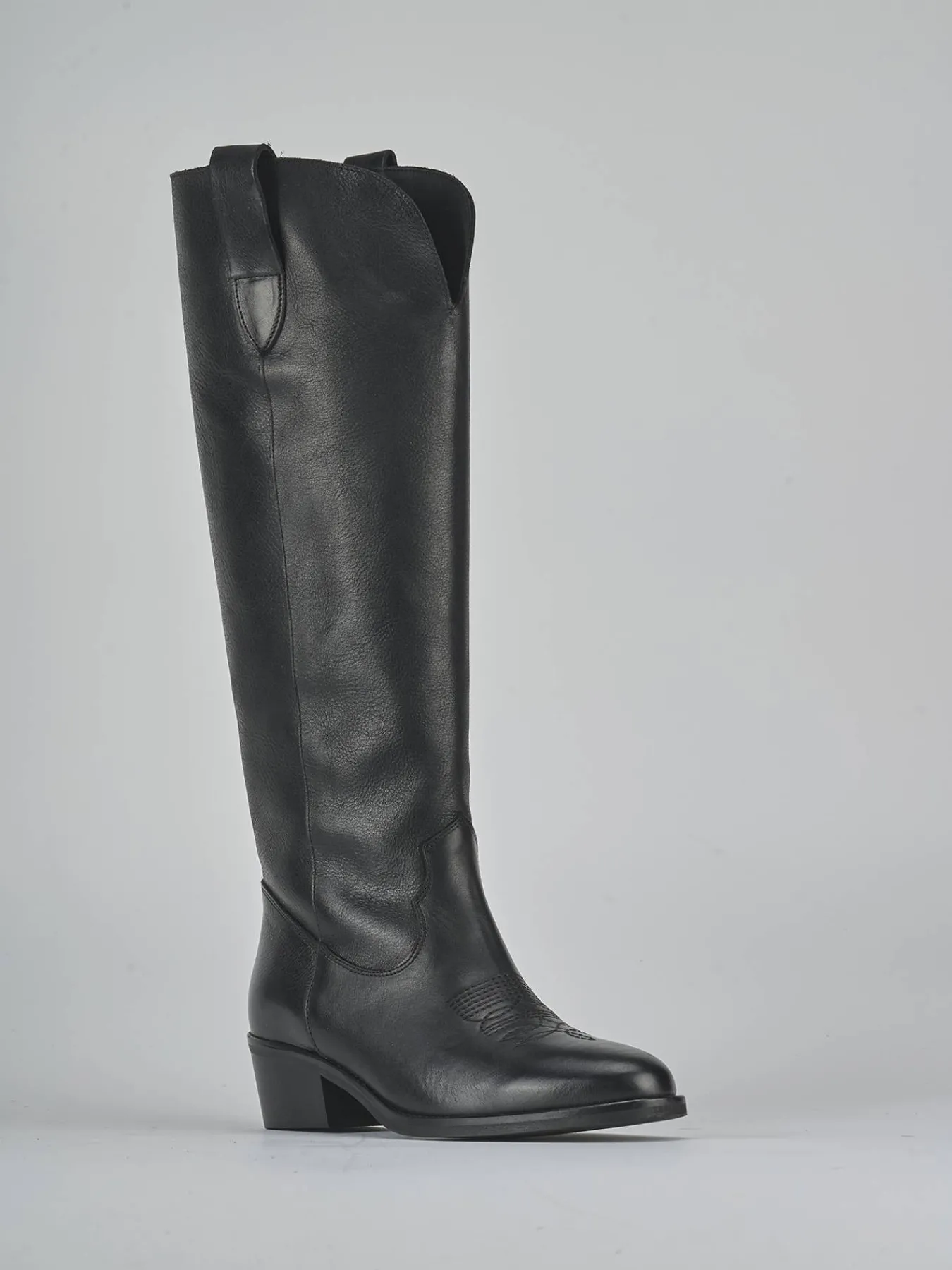 I ricami e le ghette laterali completano il design, mentre l’altezza del gambale, che arriva appena sotto il ginocchio, dona un look slanciato e chic.