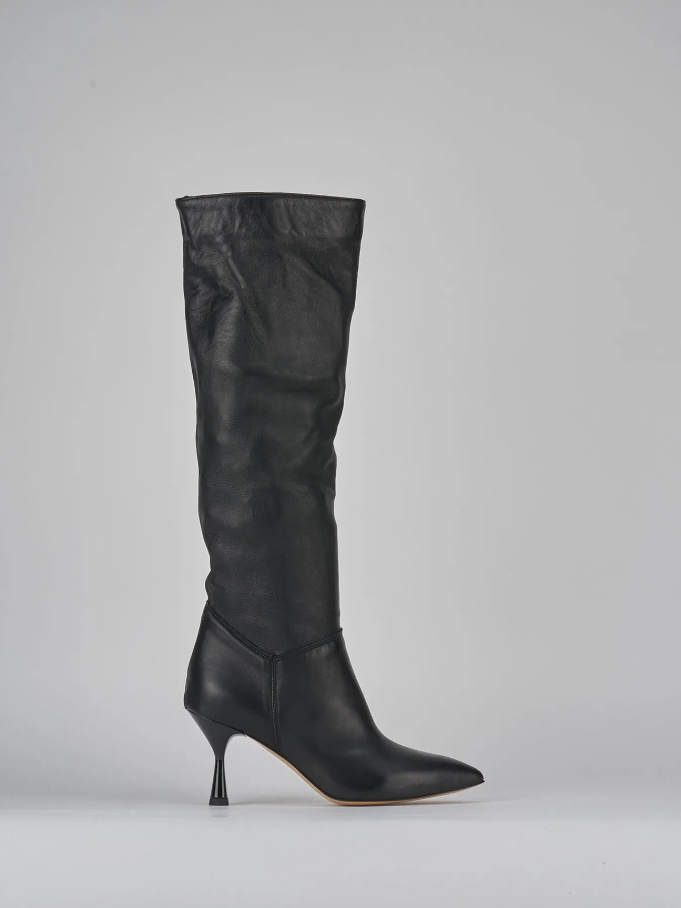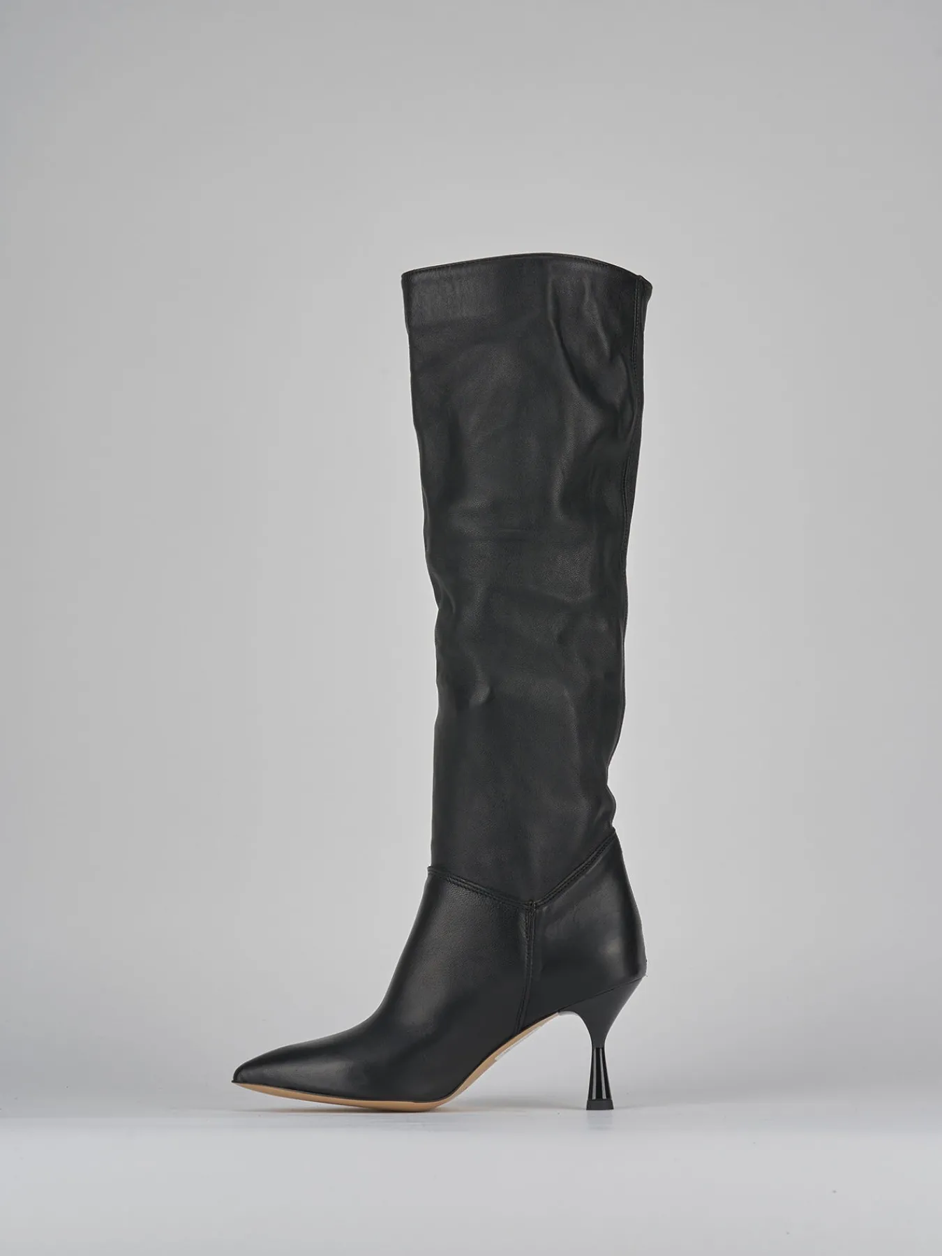 stivale tacco 7 cm fondo in leggera gomma e soletto interno in vera pelle. tomaia in morbida pelle, punta sfilata, cuciture a vista altezza caviglia, gambale sfoderato a tubo che misura altezza ginocchio e tacco rocchetto in materiale abs. dal design che va oltre le stagioni.