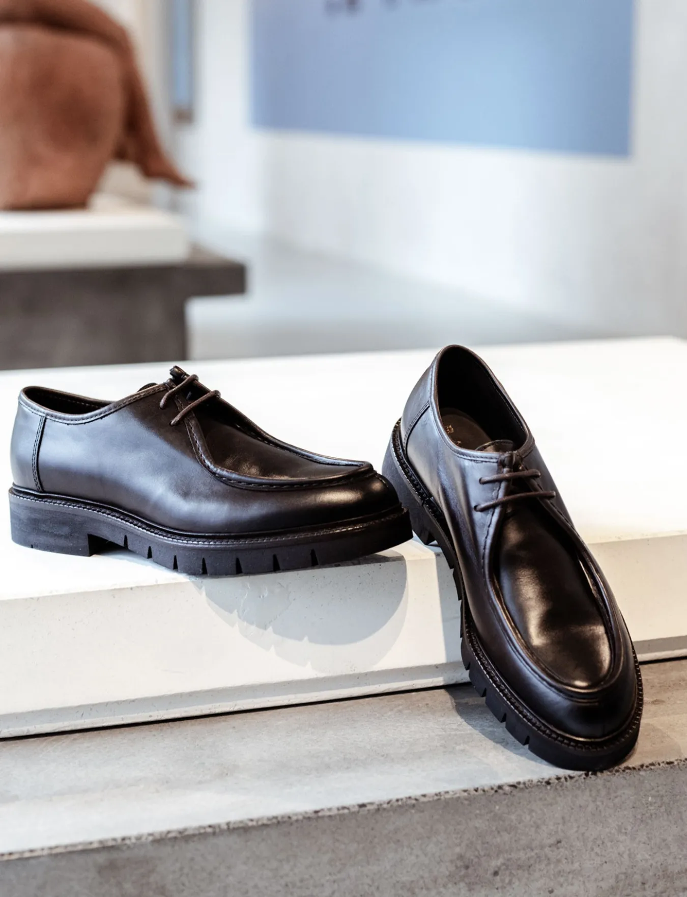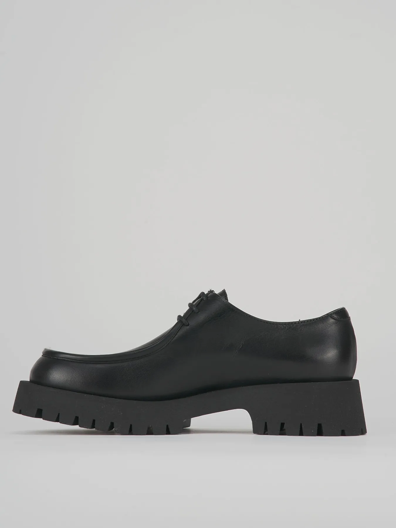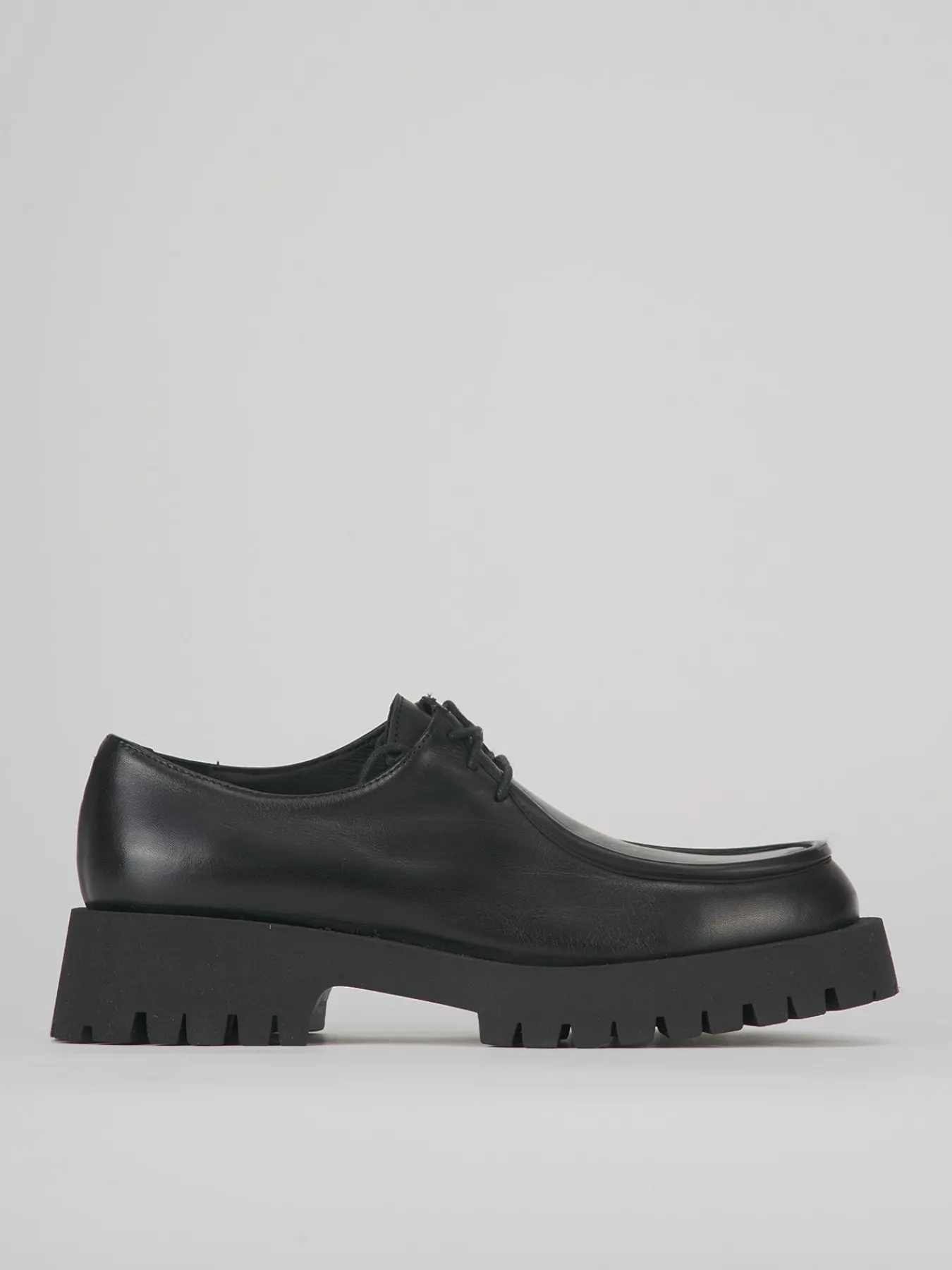 Stringata tacco 3 cm, fondo in gomma e soletto interno in vera pelle. Tomaia in morbido vitello, punta tonda, lace e cuciture alla norvegese in rilievo per un look cool.