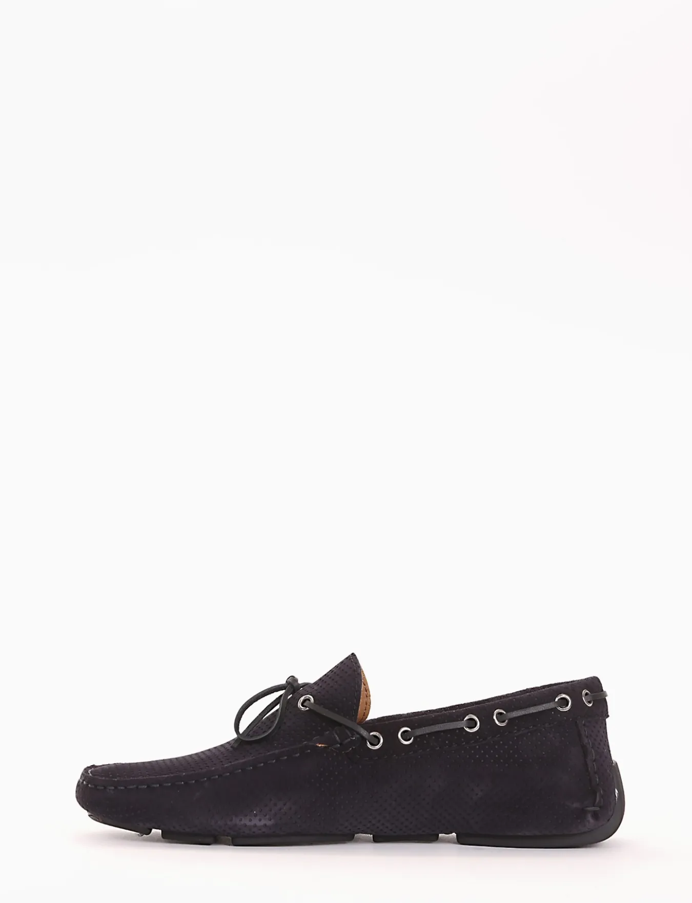 mocassino fondo gomma e soletto interno in vera pelle. Tomaia in morbidissimo camoscio con traforatura a piccoli quadrati , laccetto in pelle sul collo del piede.