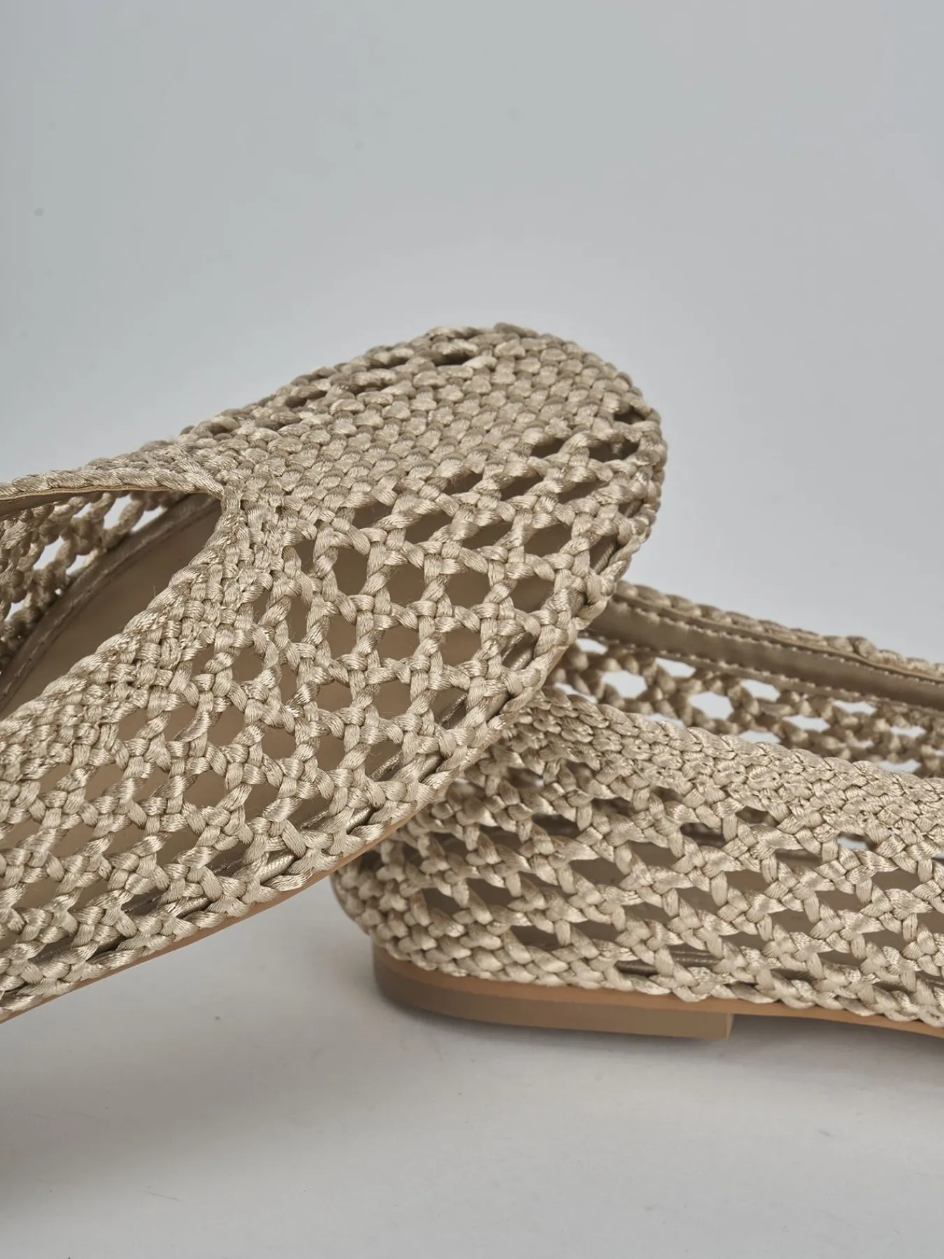 Realizzate in un tessuto beige laminato traforato e intrecciato, queste calzature offrono un design unico e sofisticato.