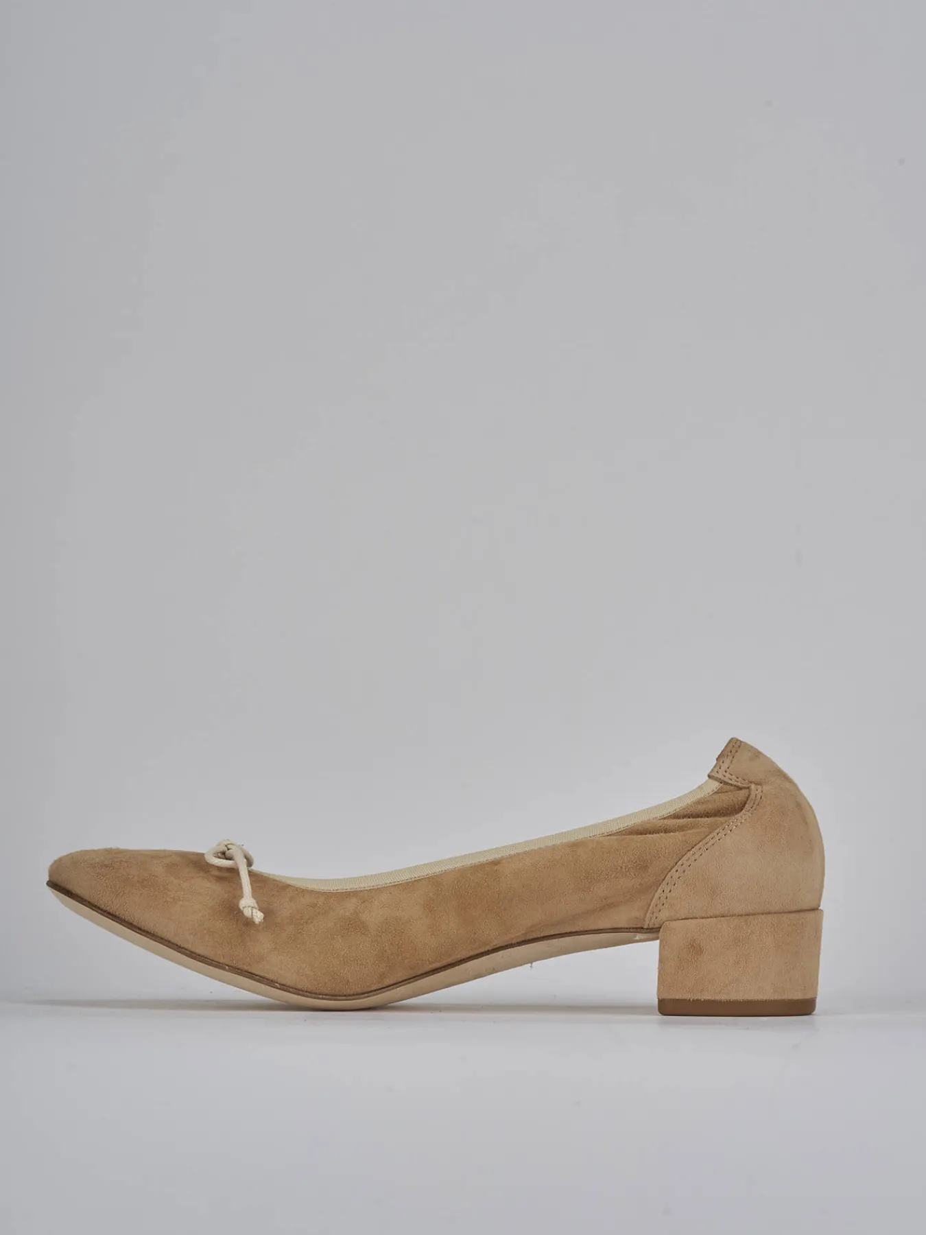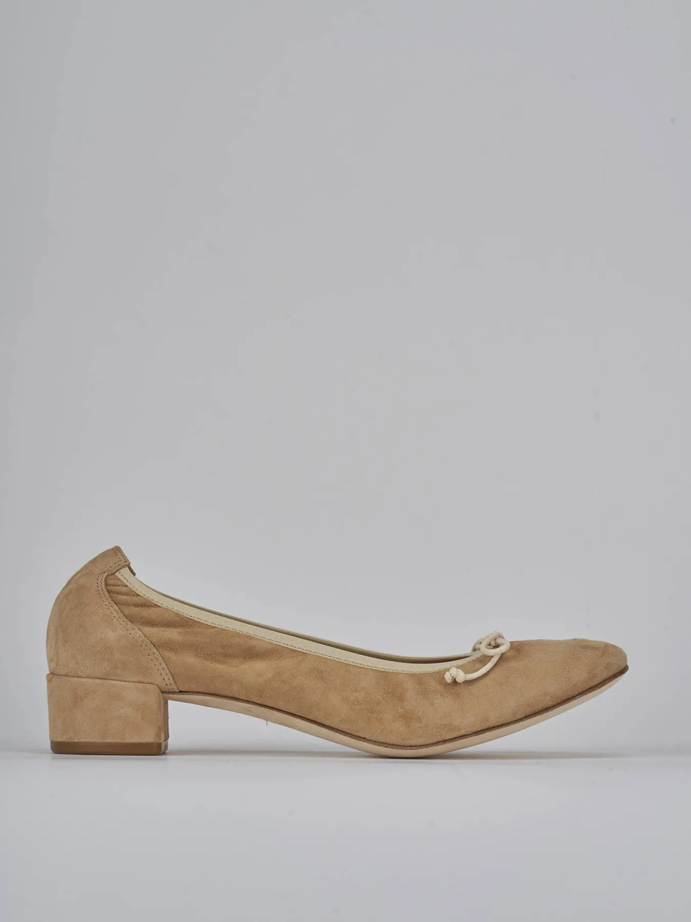 Ballerina tacco 3.5 cm fondo in cuoio e soletto interno in vera pelle. tomaia in morbido camoscio, punta tonda, fiocco in punta, bordi in tessuto ton sur ton elasticizzati per il massimo del comfort. Tacco grosso comodo. Perfetto per le tue occasioni più speciali.