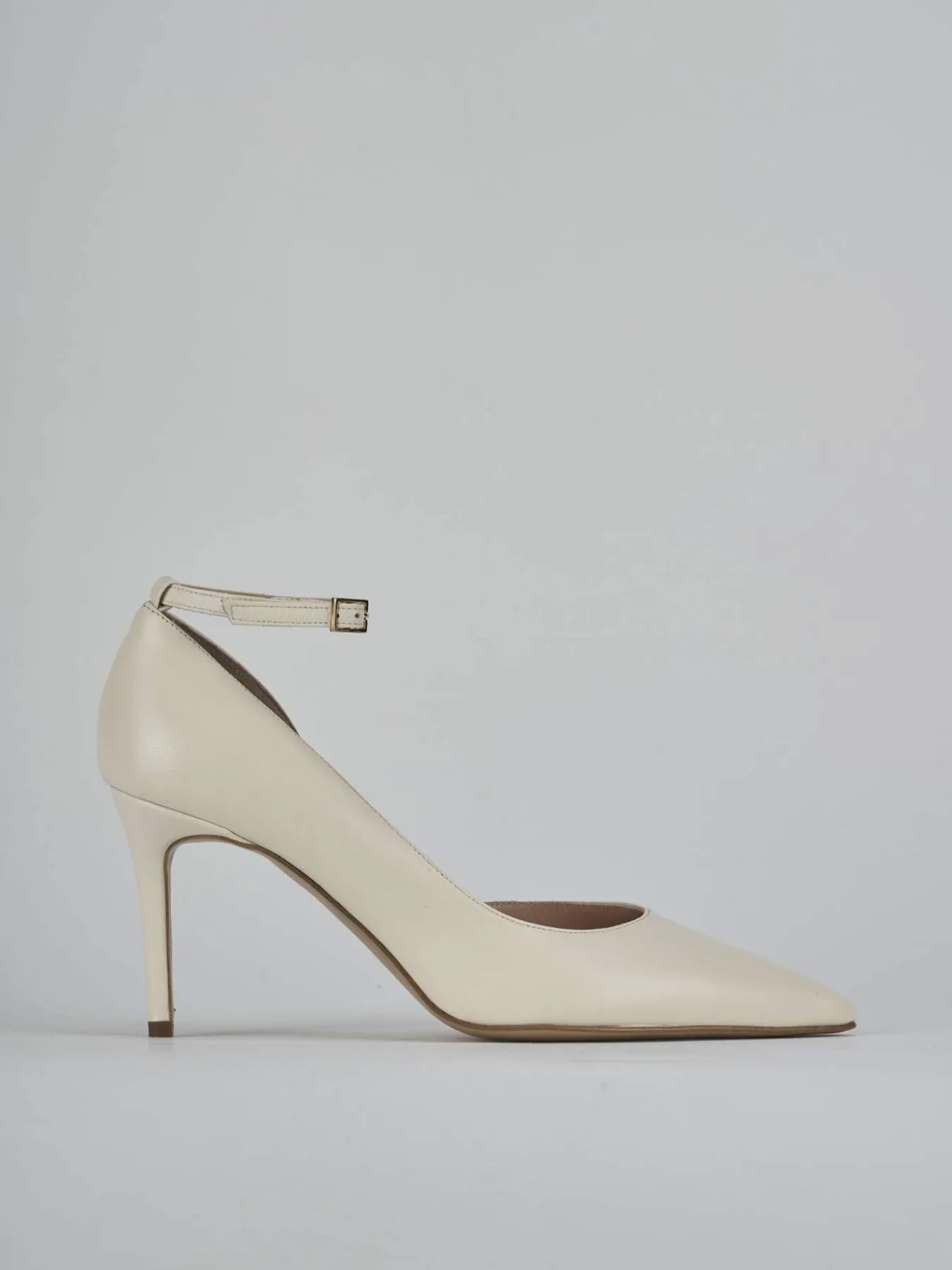Bebe’ tacco 7 cm fondo in cuoio e soletto interno in vera pelle. Tomaia in morbida pelle nappata, punta sfilata, scollo morbido a ‘U’, lato interno aperto, cinturino in caviglia con fibbia regolabile e nuovissimo tacco per un look cool.