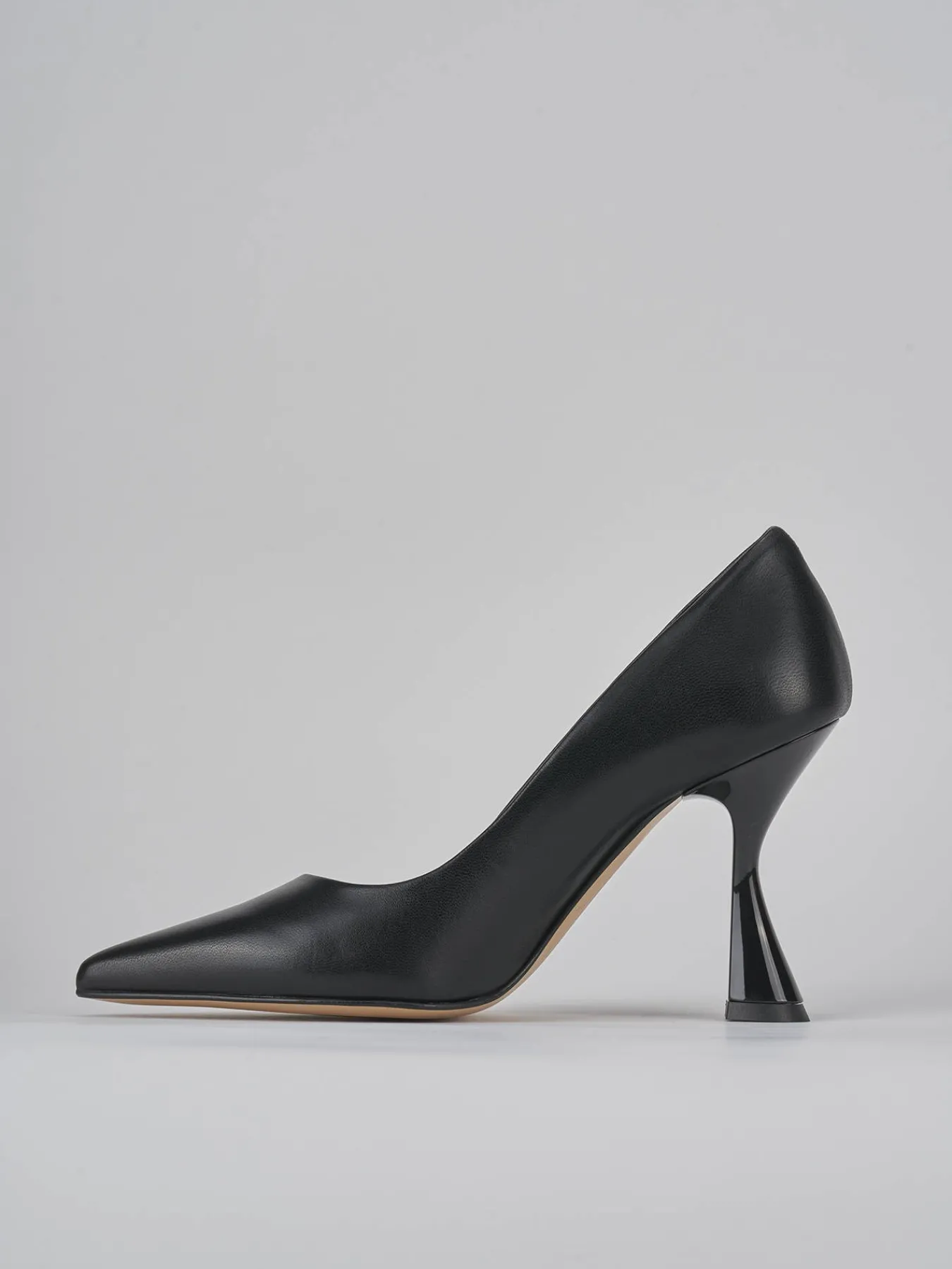 Decoltè tacco 9 cm fondo in cuoio e soletto interno in vera pelle. Tomaia in morbida pelle nappata, punta sfilata, apertura svasata e tacco rocchetto in materiale abs per un look estremamente versatile.