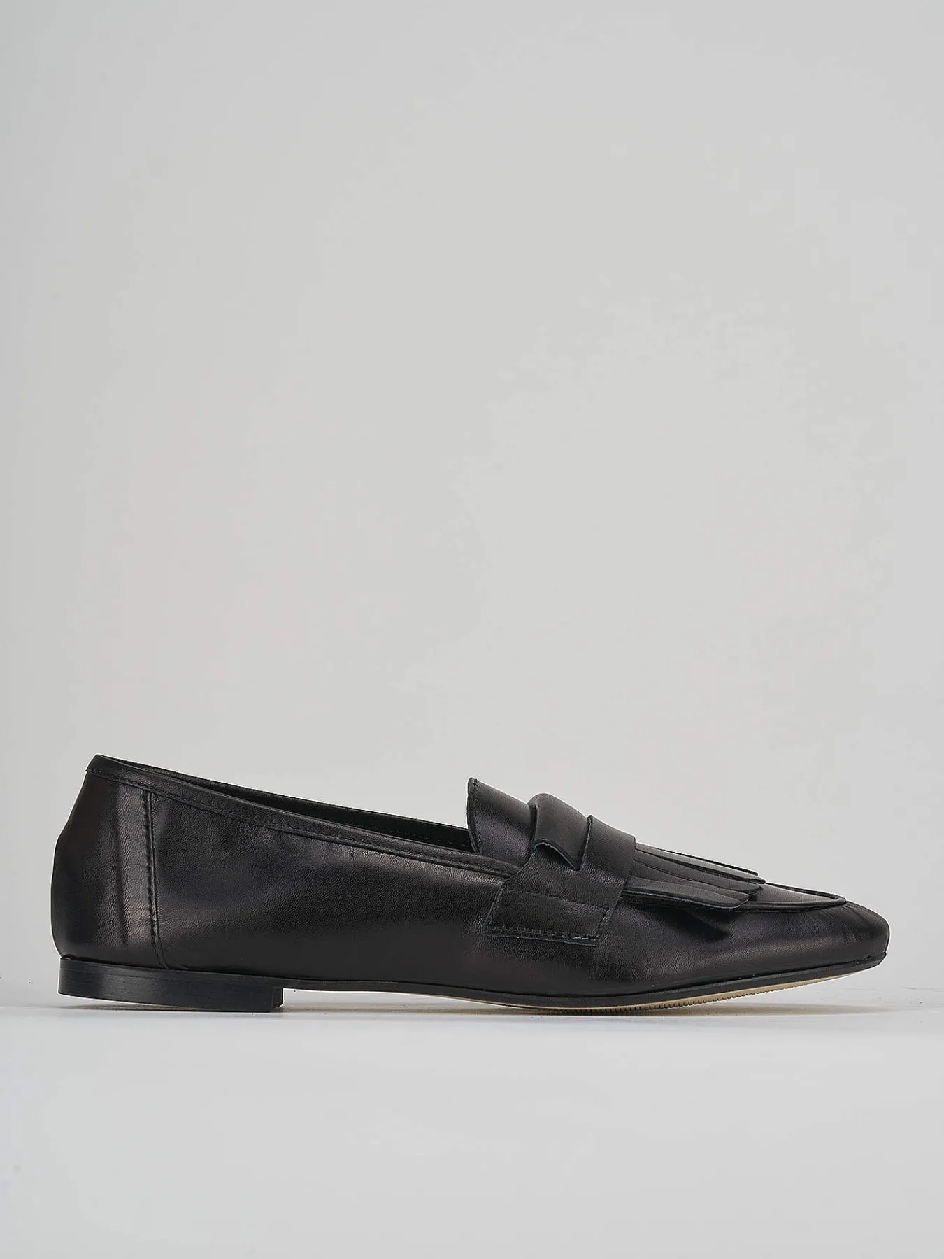 Realizzati in morbida pelle nera, questi mocassini presentano un tacco basso di 1 cm, ideale per garantire comodità durante tutta la giornata.