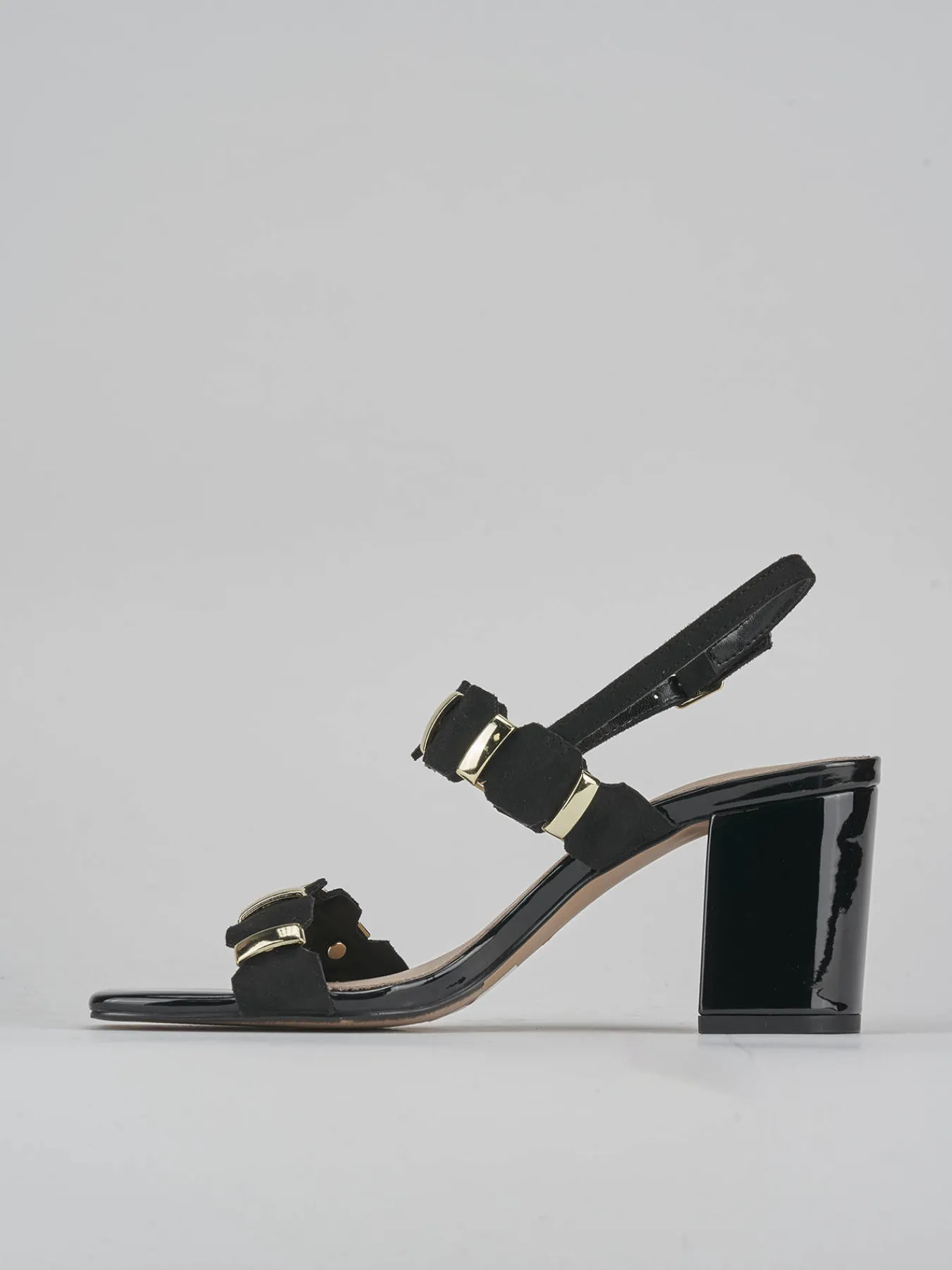 Sandalo tacco 8 cm fondo in leggerissima gomma e soletto interno in vera pelle. Tomaia in morbida pelle effetto verniciato, punta squadrata, due fasce con accessori in metallo e in camoscio e cinturino con fibbia regolabile. Tacco grosso comodo, perfetto per qualsiasi sia la tua occasione.