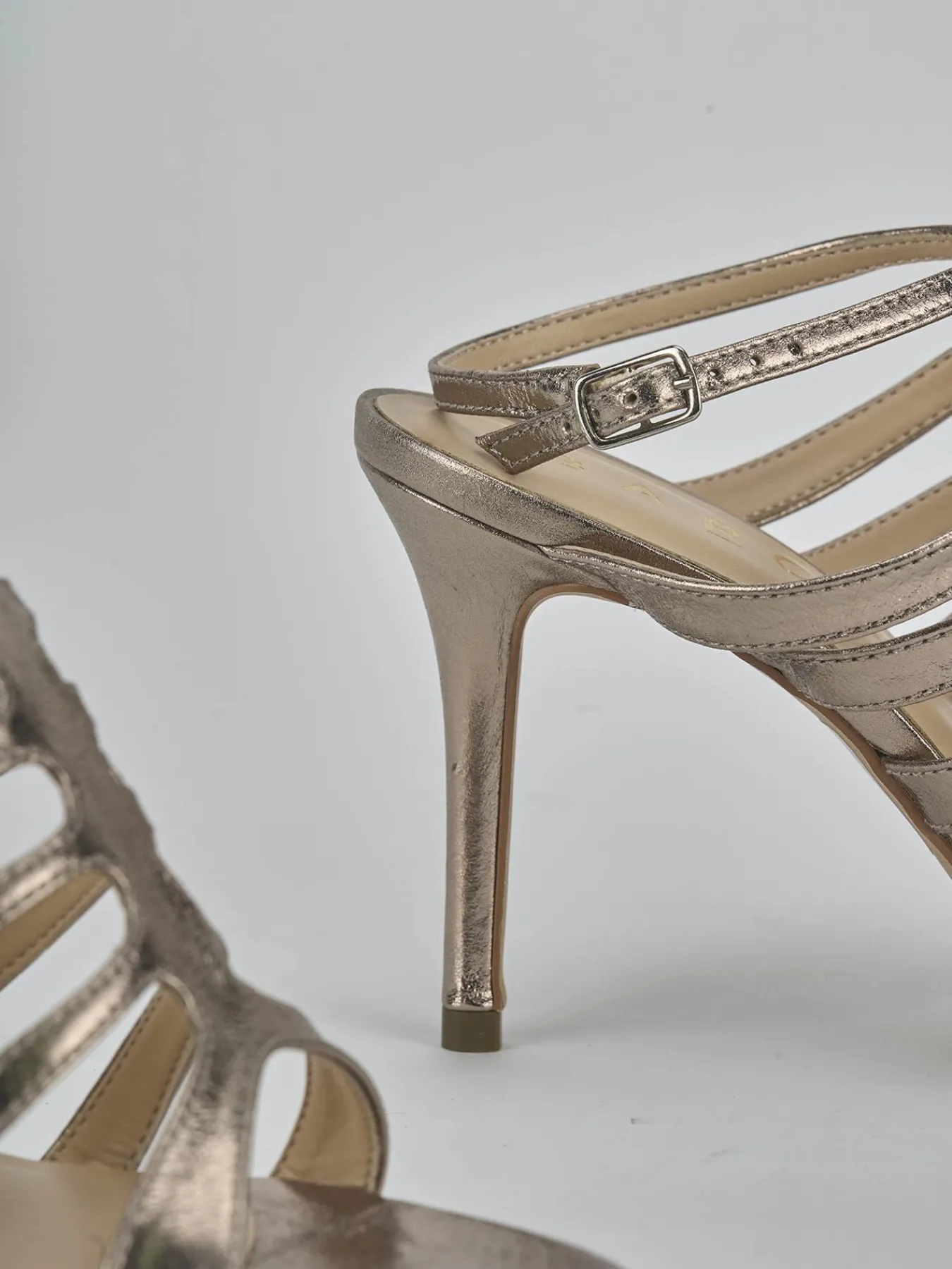 Sandalo tacco 9 cm fondo in leggerissima gomma e soletto interno in vera pelle. Tomaia in morbida pelle effetto laminato nuances platino, punta affusolata, mini fasce unite dal cinturino ‘T’ che arriva fino alla cavigliera con fibbia regolabile per un look cool.Ideale per tutti i tuoi eventi e cerimonie piu’ importanti.
