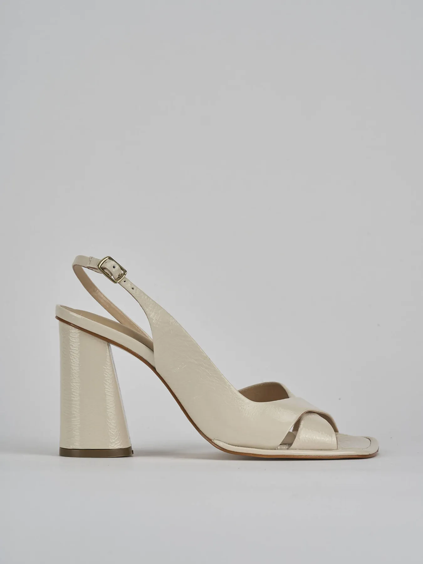 Sandalo tacco 9 cm fondo in leggerissima gomma e soletto interno in vera pelle. tomaia in morbida pelle effetto verniciato, punta squadrata, due fasce incrociate, cinturino con fibbia regolabile e tacco grosso a cono superchic. Perfetto per qualsiasi tua occasione.
