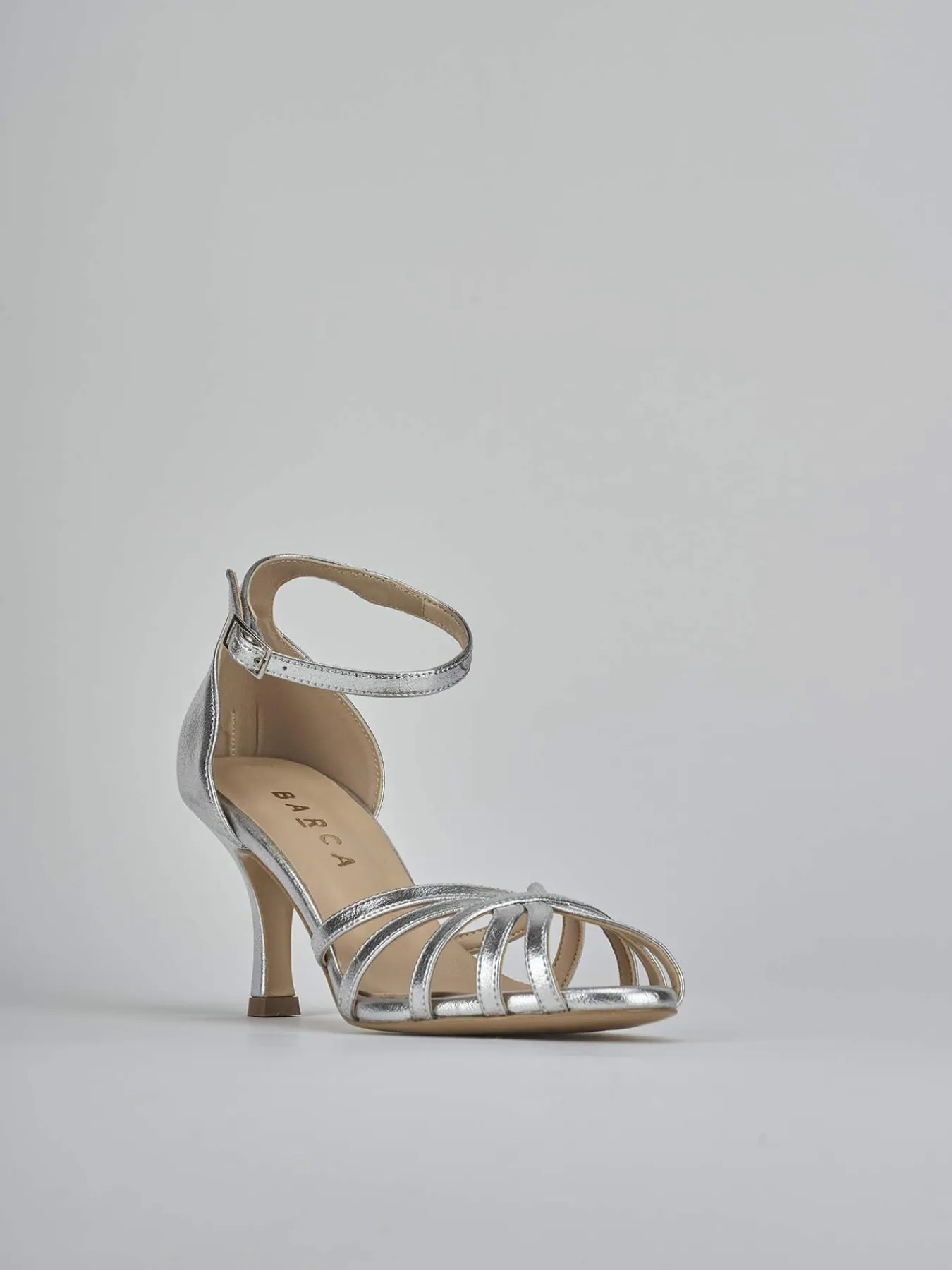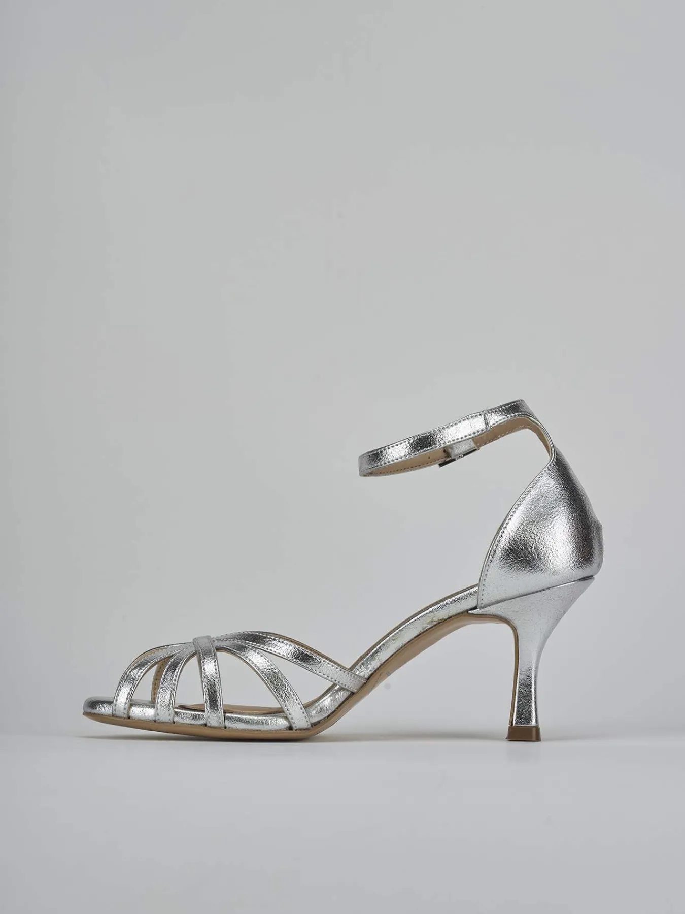 Sandalo tacco 7 cm, fondo in leggerissima gomma e soletto interno in vera pelle. Tomaia in morbida nappa effetto laminato, punta affusolata con fascia a cestina aperta in punta, cinturino in caviglia con fibbia regolabile e tallone chiuso. per un look so-cool!