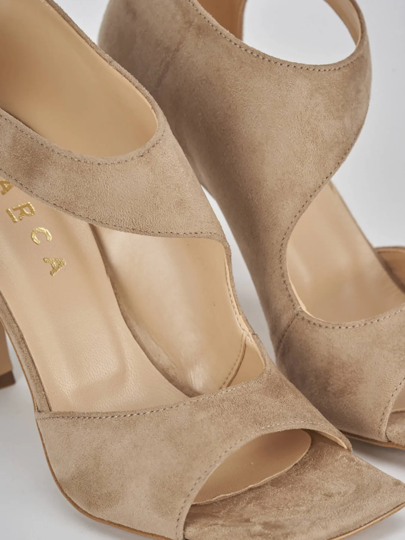 Sandalo tacco 9 cm, fondo in leggerissima gomma e soletto interno in vera pelle. Tomaia in morbido camoscio, punta squadrata con fascia unica in punta, chiusura laterale con fascia svasata in caviglia e cerniera come chiusura, per dare un tocco unico ad ogni tuo look.