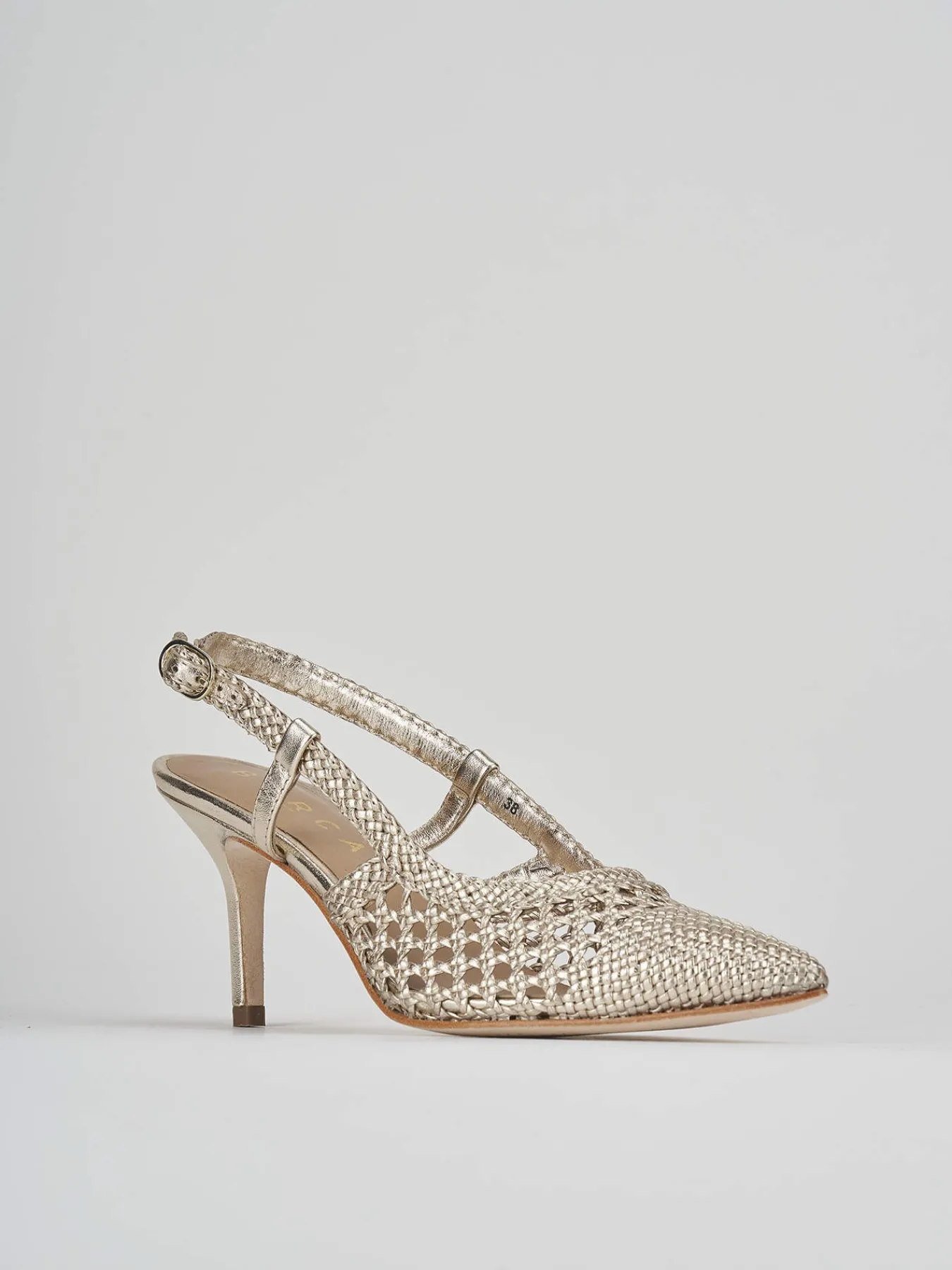 Slingback decolte tacco 7 cm fondo cuoio e soletto interno in vera pelle. tomaia in morbida pelle intrecciata artigianalmente, punta sfilata e chiusura con fibbia per un look cool-chic.