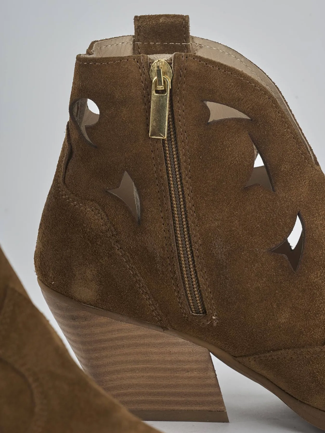Stivaletto texano 5.5 cm fondo in gomma e soletto interno in vera pelle. Tomaia in morbida pelle scamosciata, punta sfilata, ghette, cuciture in rilievo, laserato, rapida chiusura con cerniera laterale e tacco cubano. Dal design ricercato, versatile con ogni tuo look.