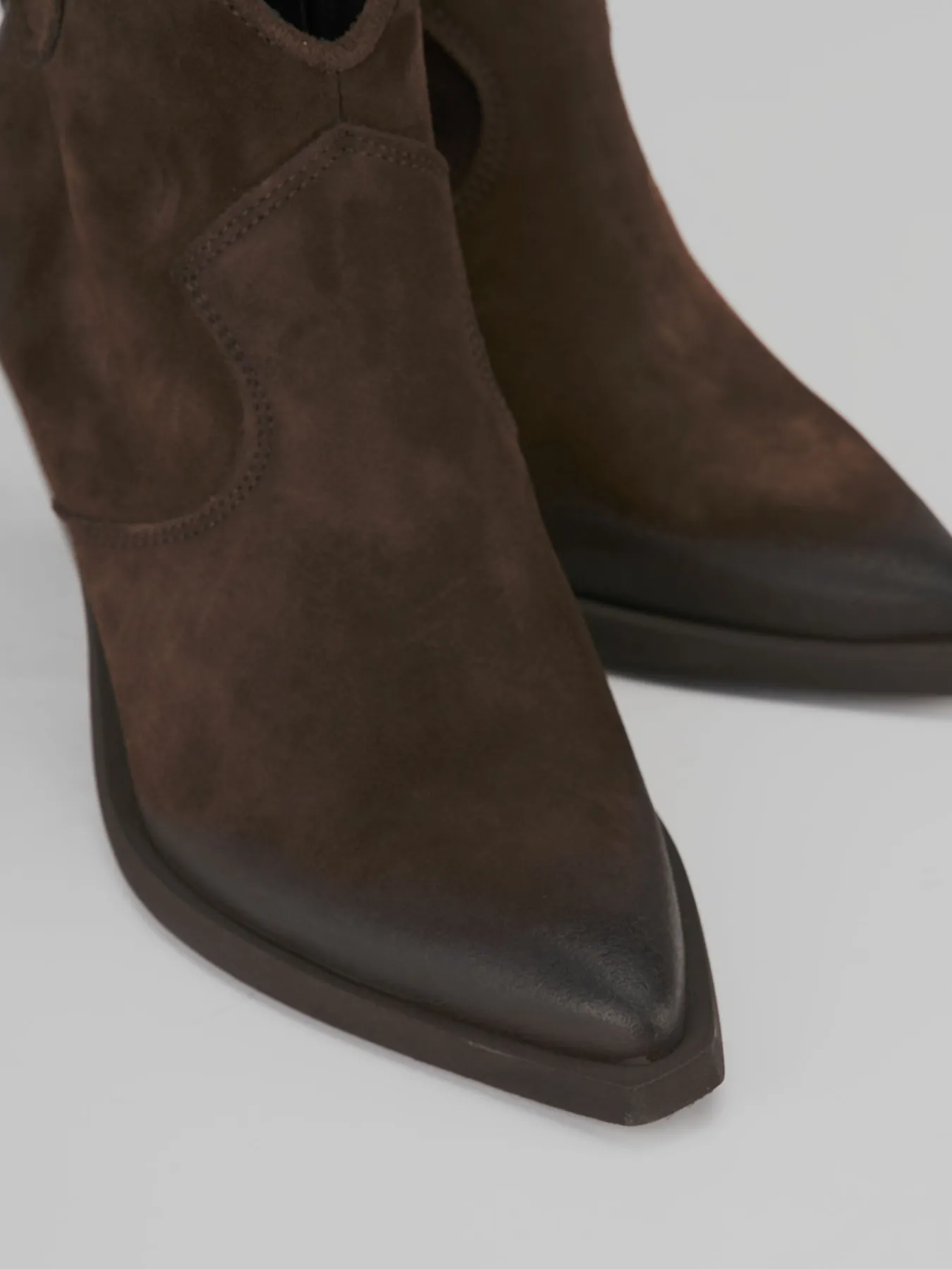 Stivaletto texano tacco 7 cm fondo in gomma e soletto interno in vera pelle. Tomaia in morbido camoscio, punta sfilata, cuciture visibili, guardolo sporgente, cerniera laterale, ghette e tacco in stile texano per un look estremamente cool adatto ad ogni tua occasione.