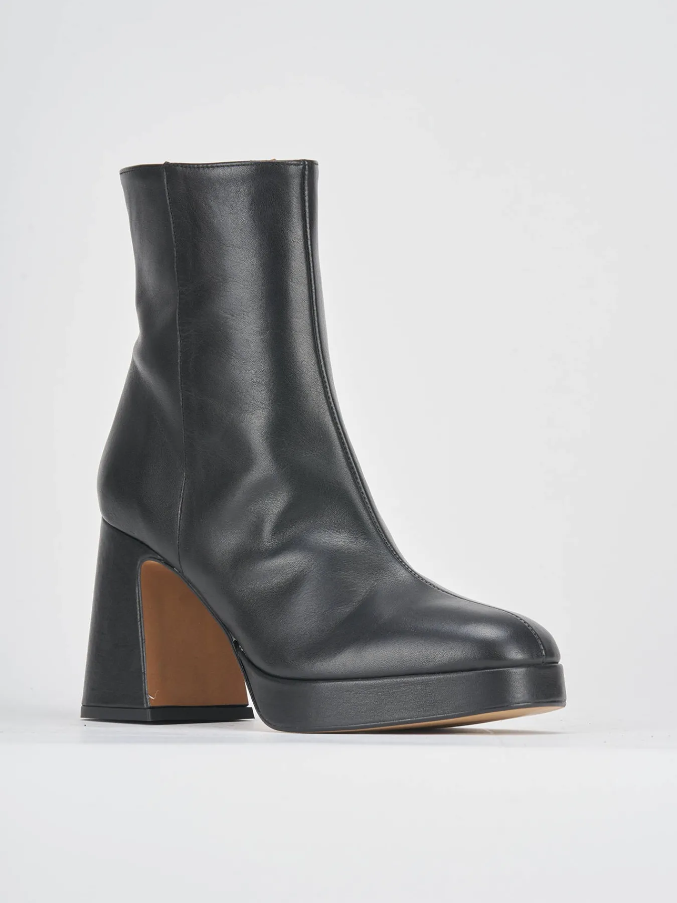 tronchetto tacco 8 cm fondo in gomma e soletto interno in vera pelle. tomaia in morbida pelle, punta affusolata, plateau di 1.5 cm sulla parte anteriore, cuciture a mano, cerniera laterale e tacco grosso per un look fierce.