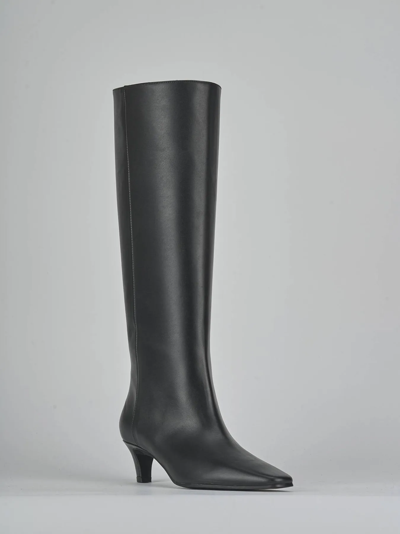 Il design presenta una punta sfilata e cuciture visibili a mano sul gambale tubolare, che arriva appena sotto il ginocchio.