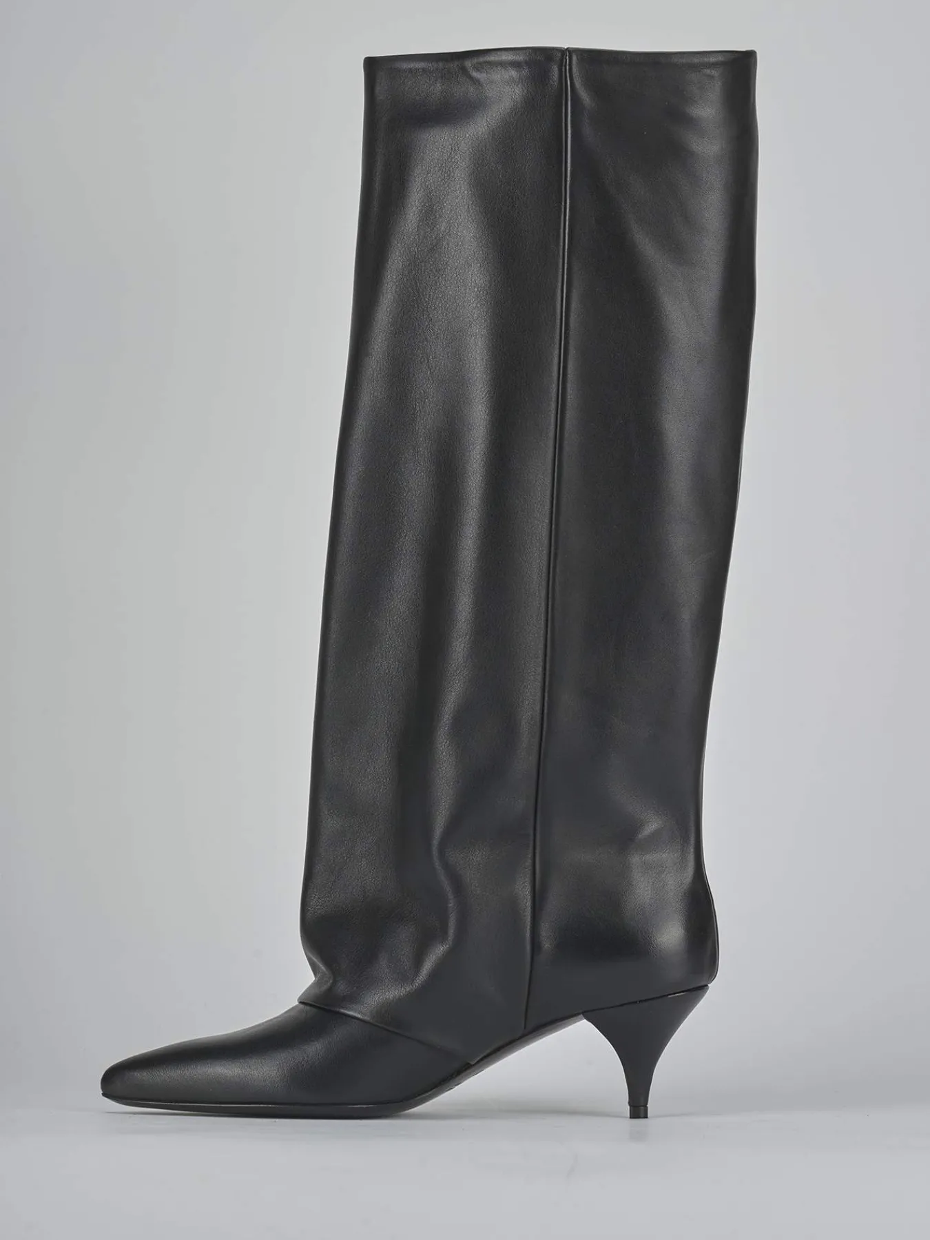 Stivale tacco 5 cm fondo in cuoio e soletto interno in vera pelle. Tomaia in morbida nappa , punta sfilata, cuciture visibili, altezza gambale fino al ginocchio ricoperto da un risvolto fino al tacco e tacco fino rocchetto. Per un look cool.