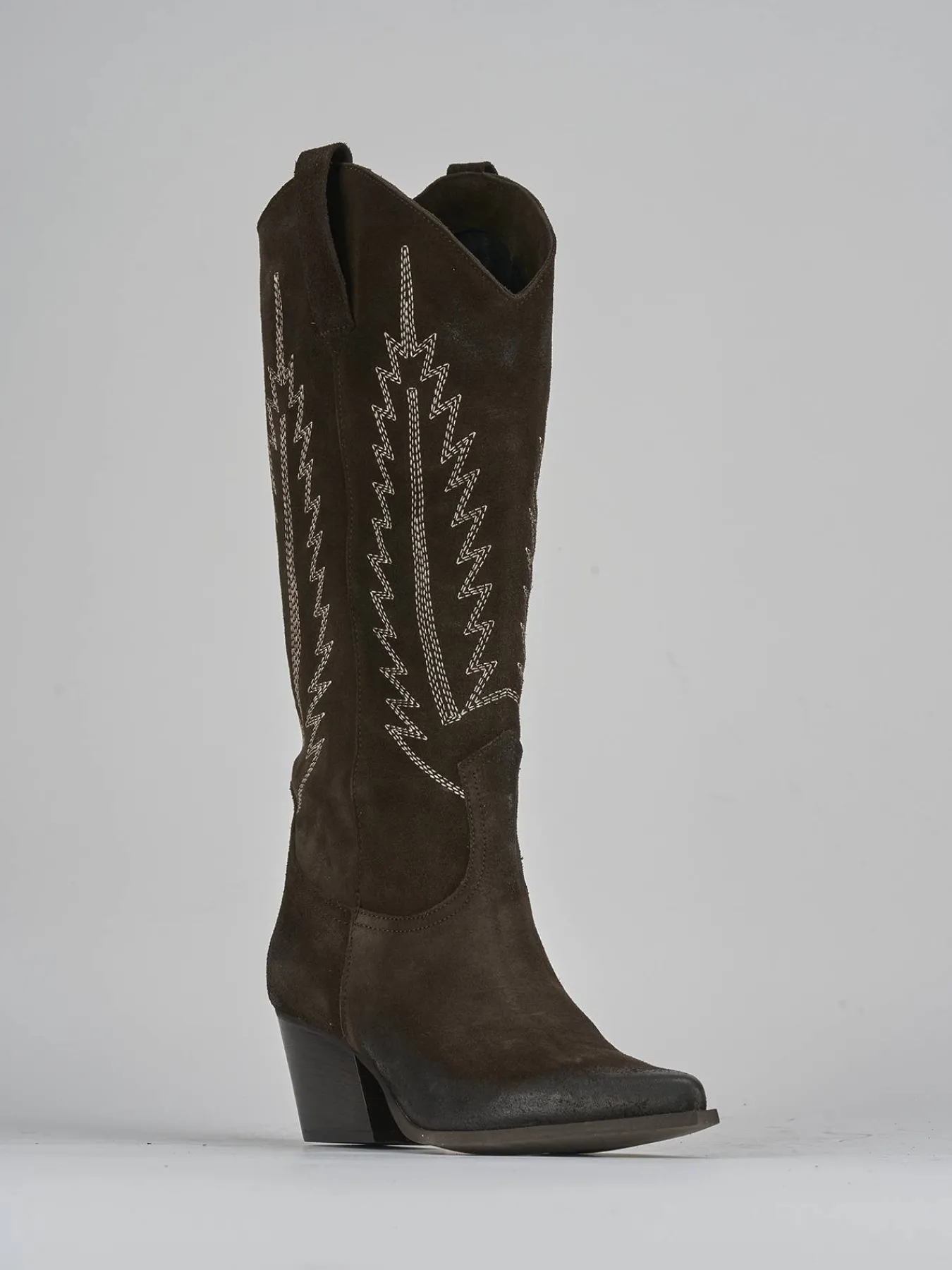 I ricami a contrasto sul gambale, che si ferma appena sotto il ginocchio, donano un dettaglio distintivo e sofisticato.