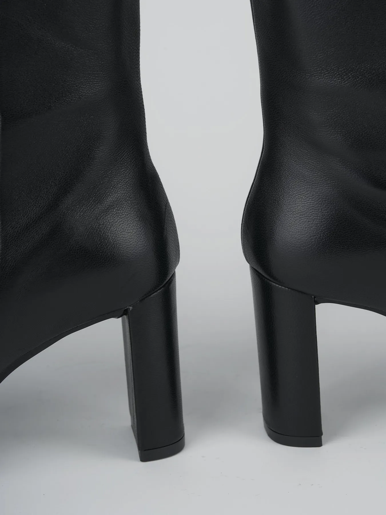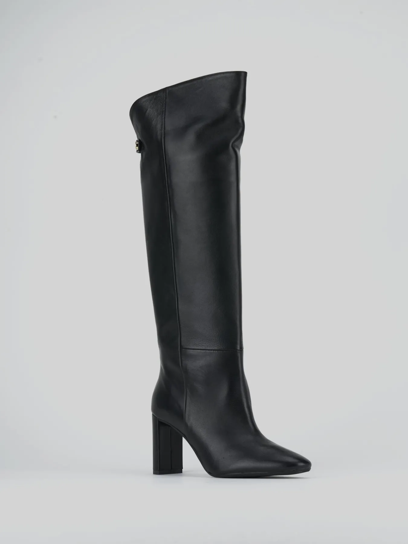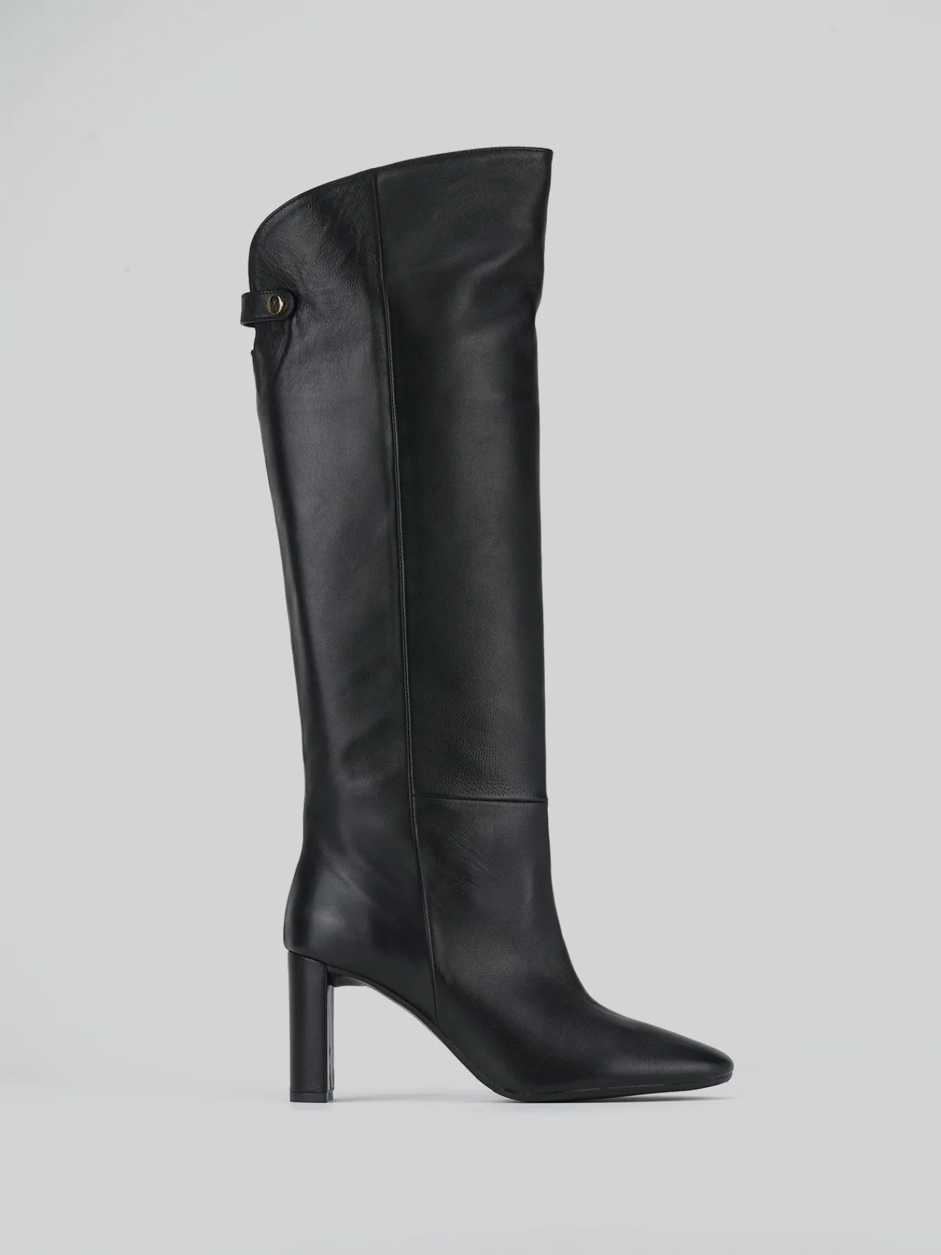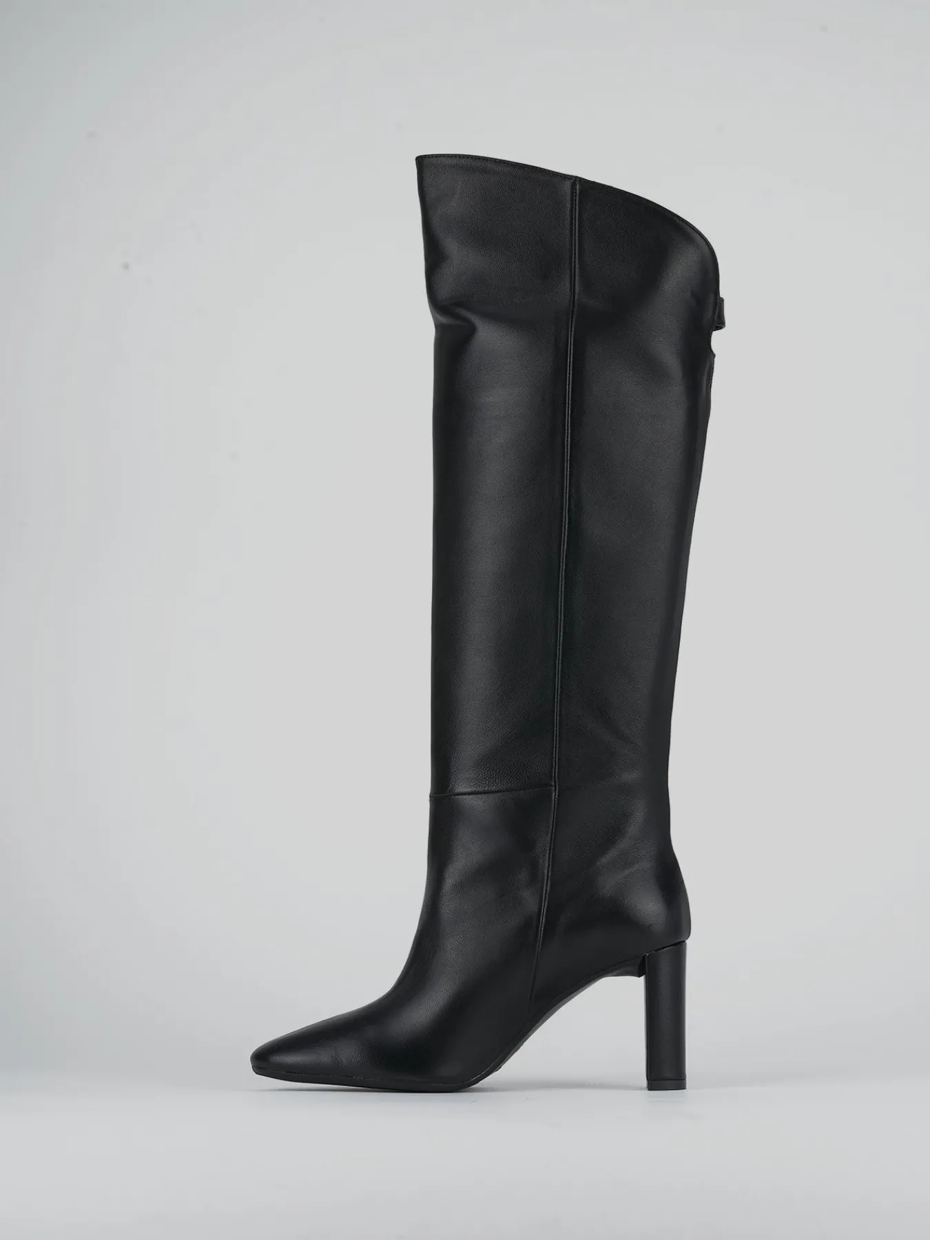 stivale tacco 8.5 cm fondo in gomma e soletto interno in vera pelle. tomaia in morbida pelle, punta sfilata leggermente squadrata, altezza gambale appena sotto ginocchio, cerniera laterale per un look cool.