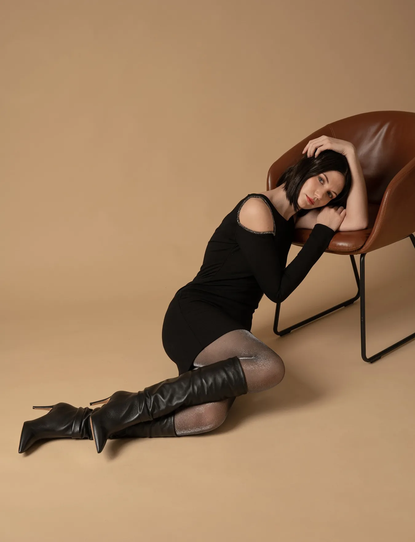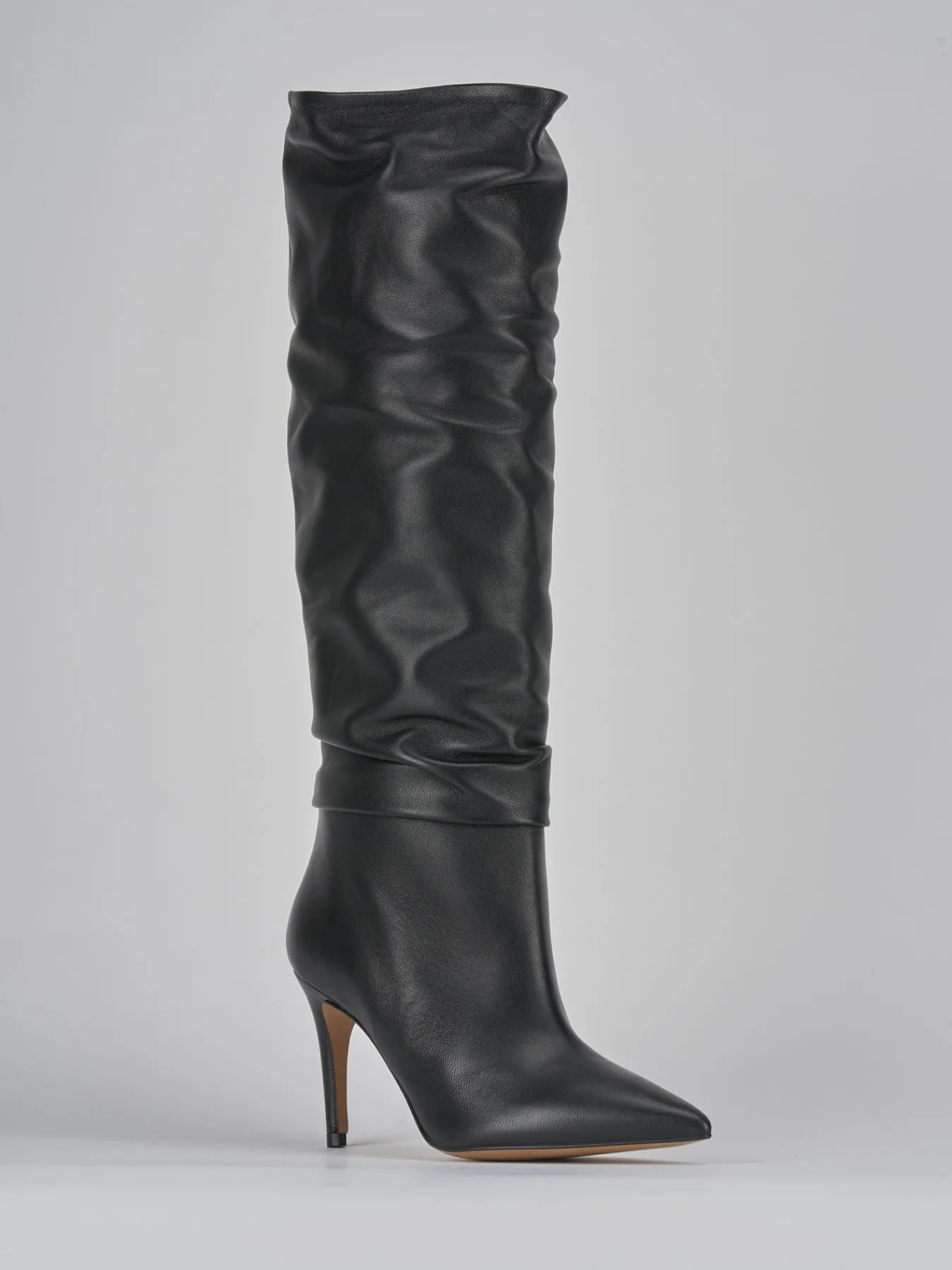 stivale tacco 8.5 cm fondo in leggera gomma e soletto interno in vera pelle. tomaia in morbida pelle nappata, punta sfilata, gambale appena sotto il ginocchio e arricciato, tacco fino per un look cool.
