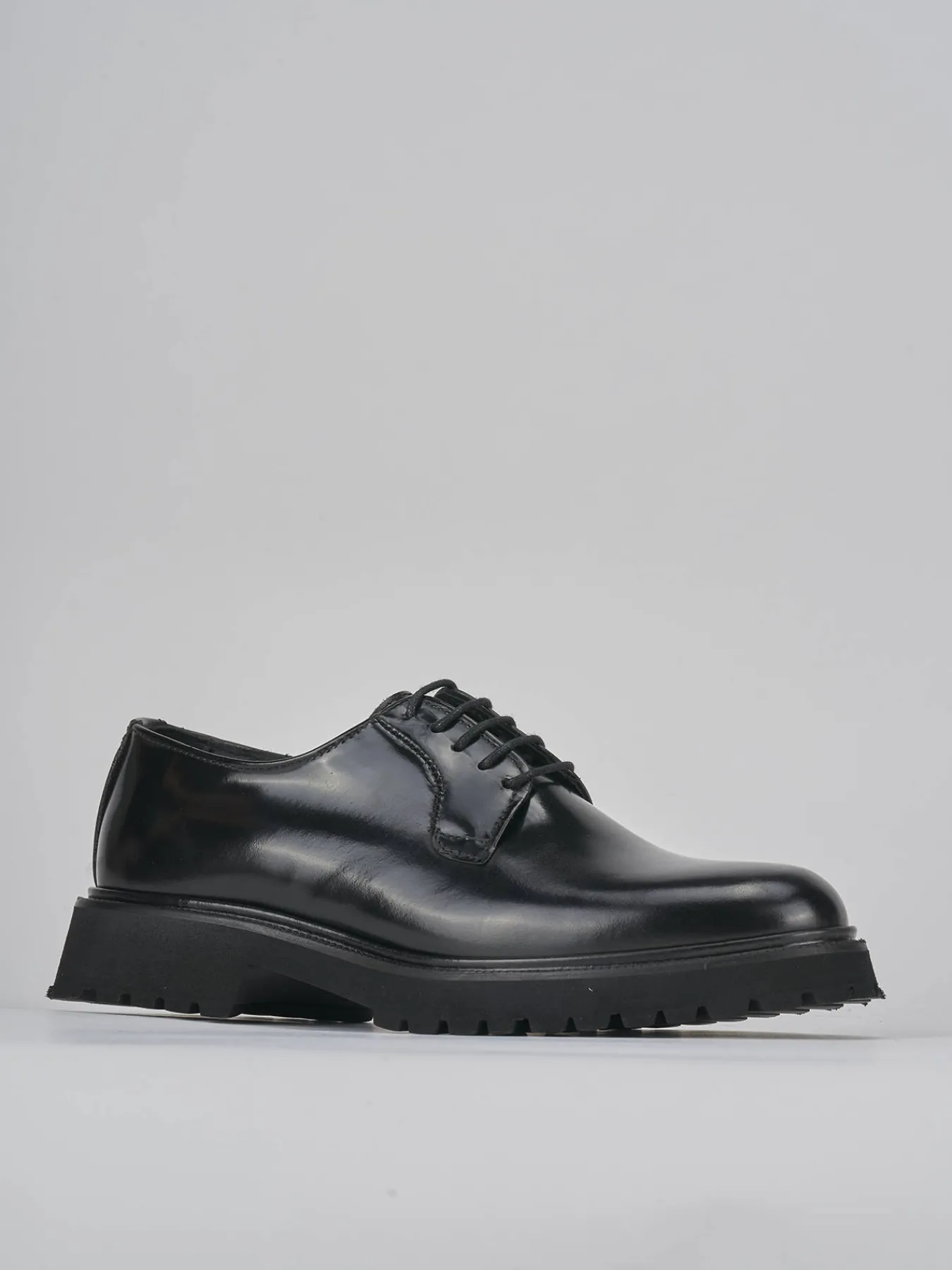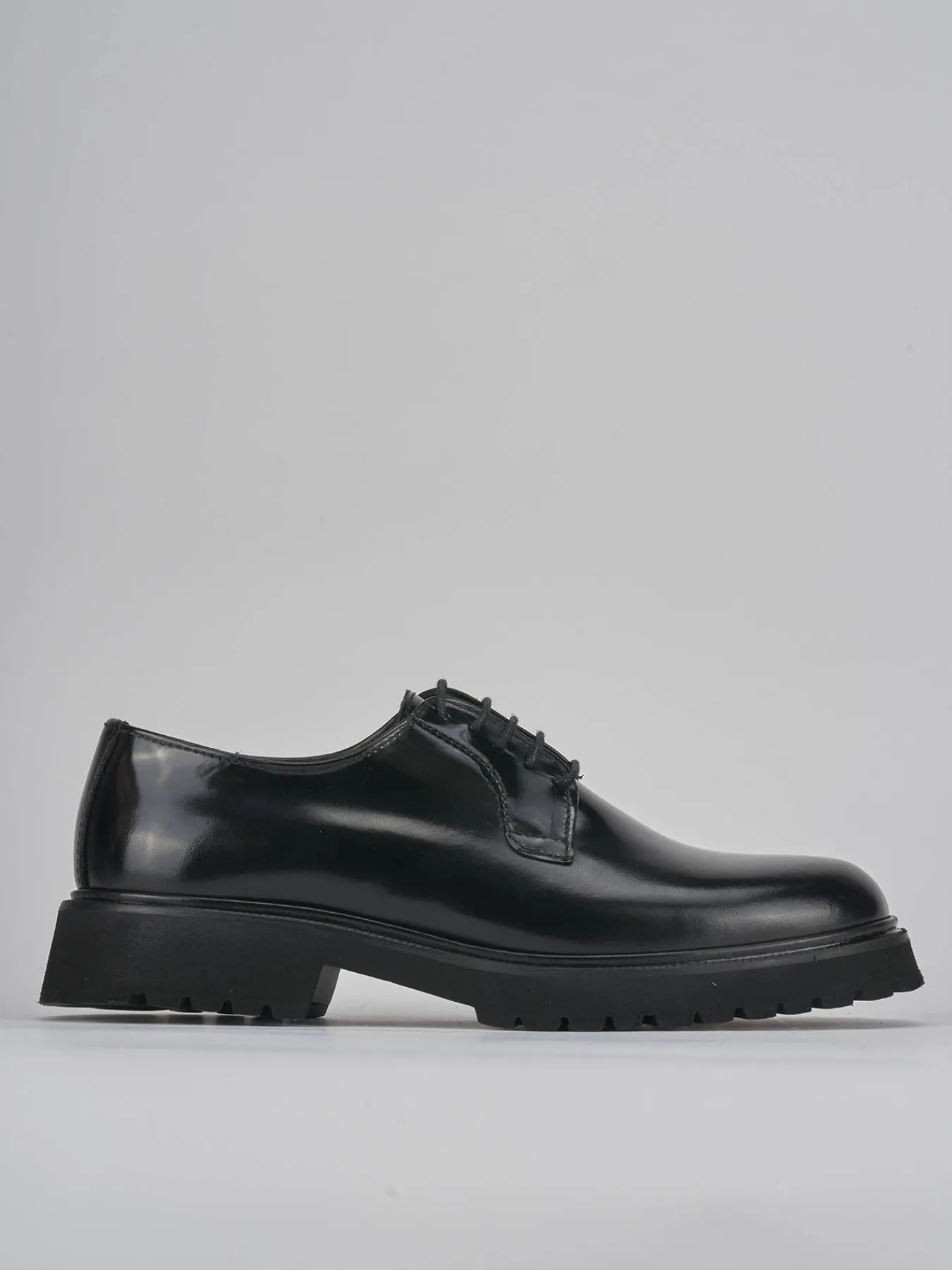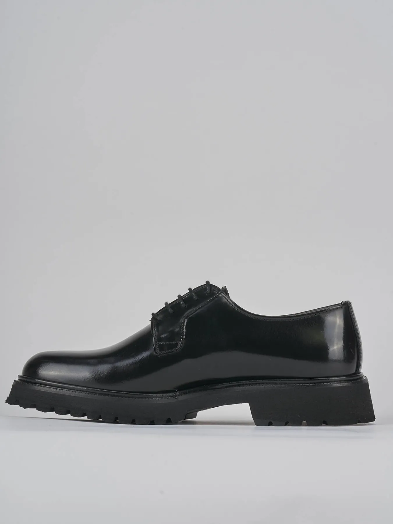 Stringata tacco 2 cm fondo in gomma e soletto interno in vera pelle. Tomaia in morbida pelle abrasivata effetto lucido, punta tonda, modello derby, lace e fondo light per un look cool.