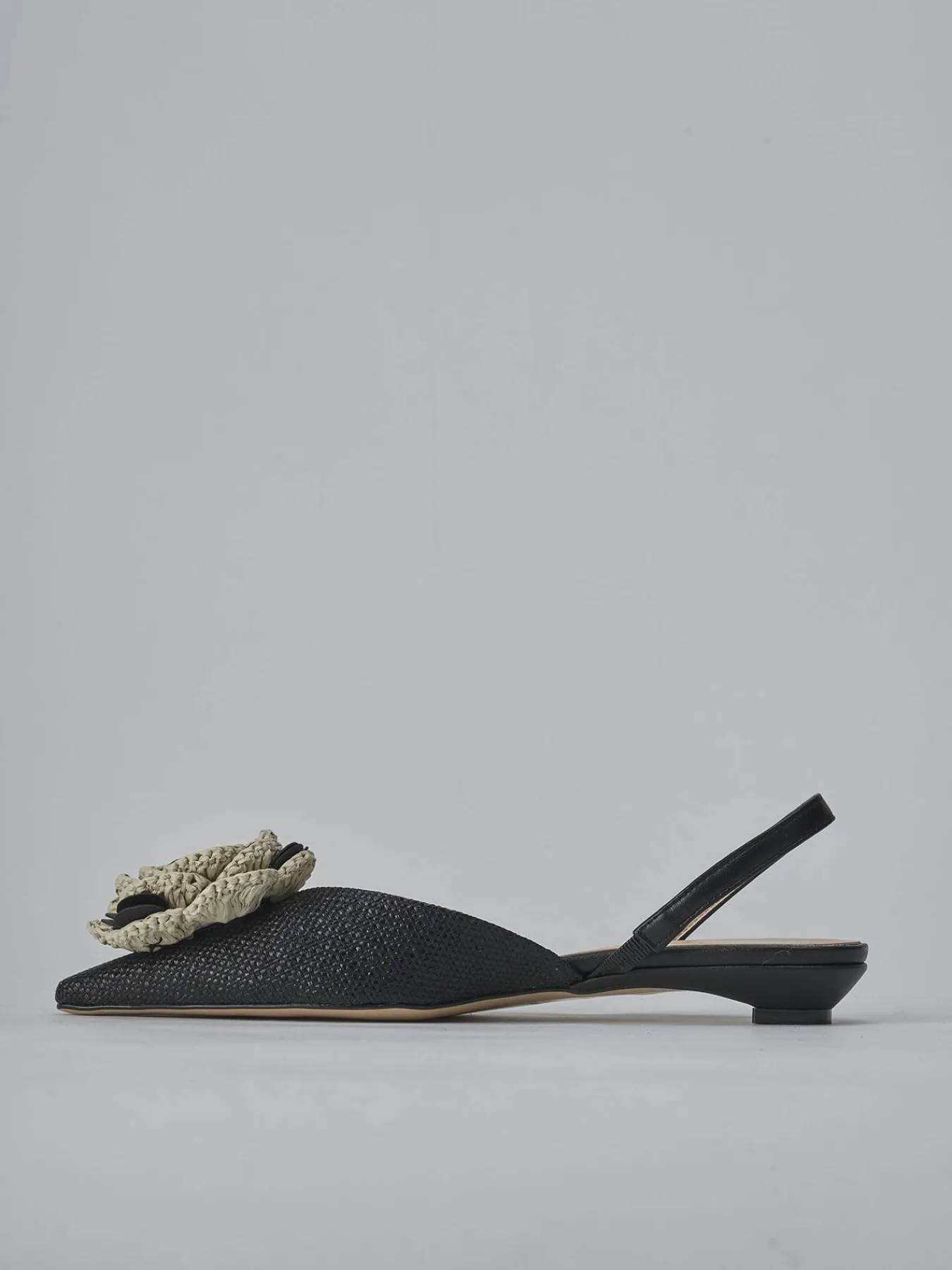 Ballerina tacco 2 cm fondo in leggerissima gomma e soletto interno in vera pelle. Tomaia in morbida pelle foderata di rafia, punta sfilata, scollo morbido a ‘U’, accessorio floreale, cinturino elasticizzato e tacco a cono stabile. Per le tue occasioni più speciali.
