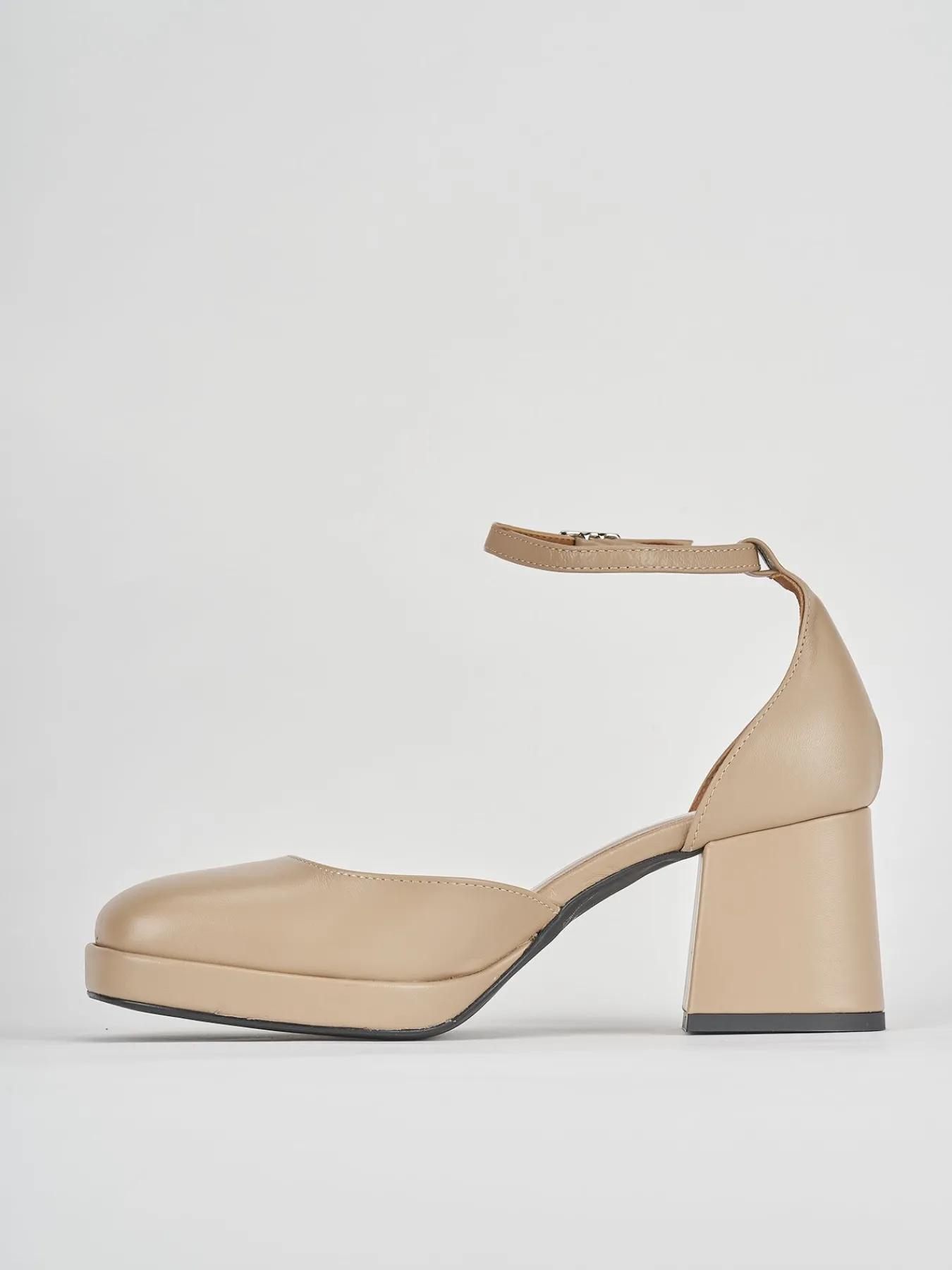 bebe’ tacco 5 cm, fondo gomma e soletto interno in vera pelle. tomaia in morbida pelle, tacco grosso e squadrato, cinturino in caviglia e platform in punta di 2 cm per un look rock cool.