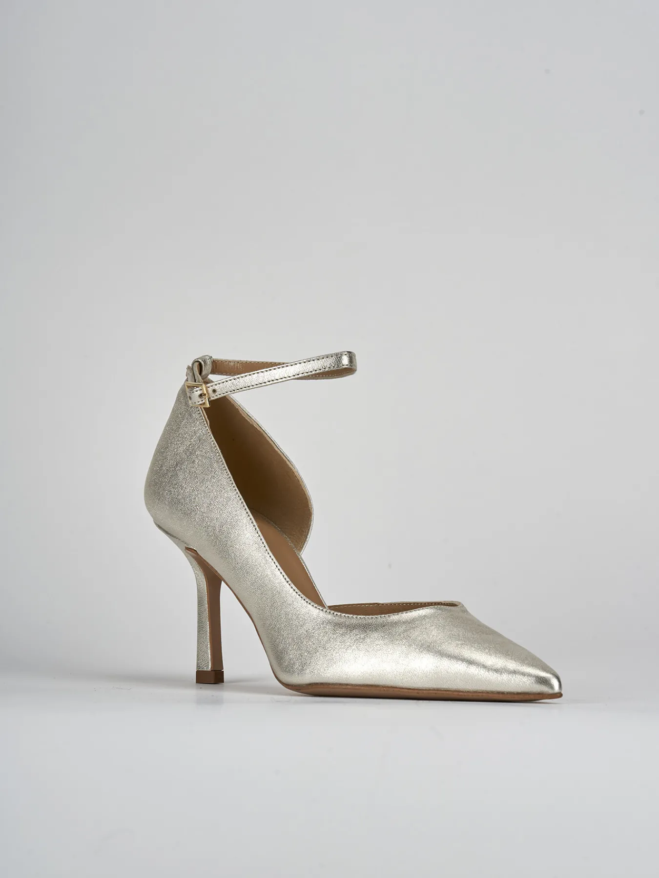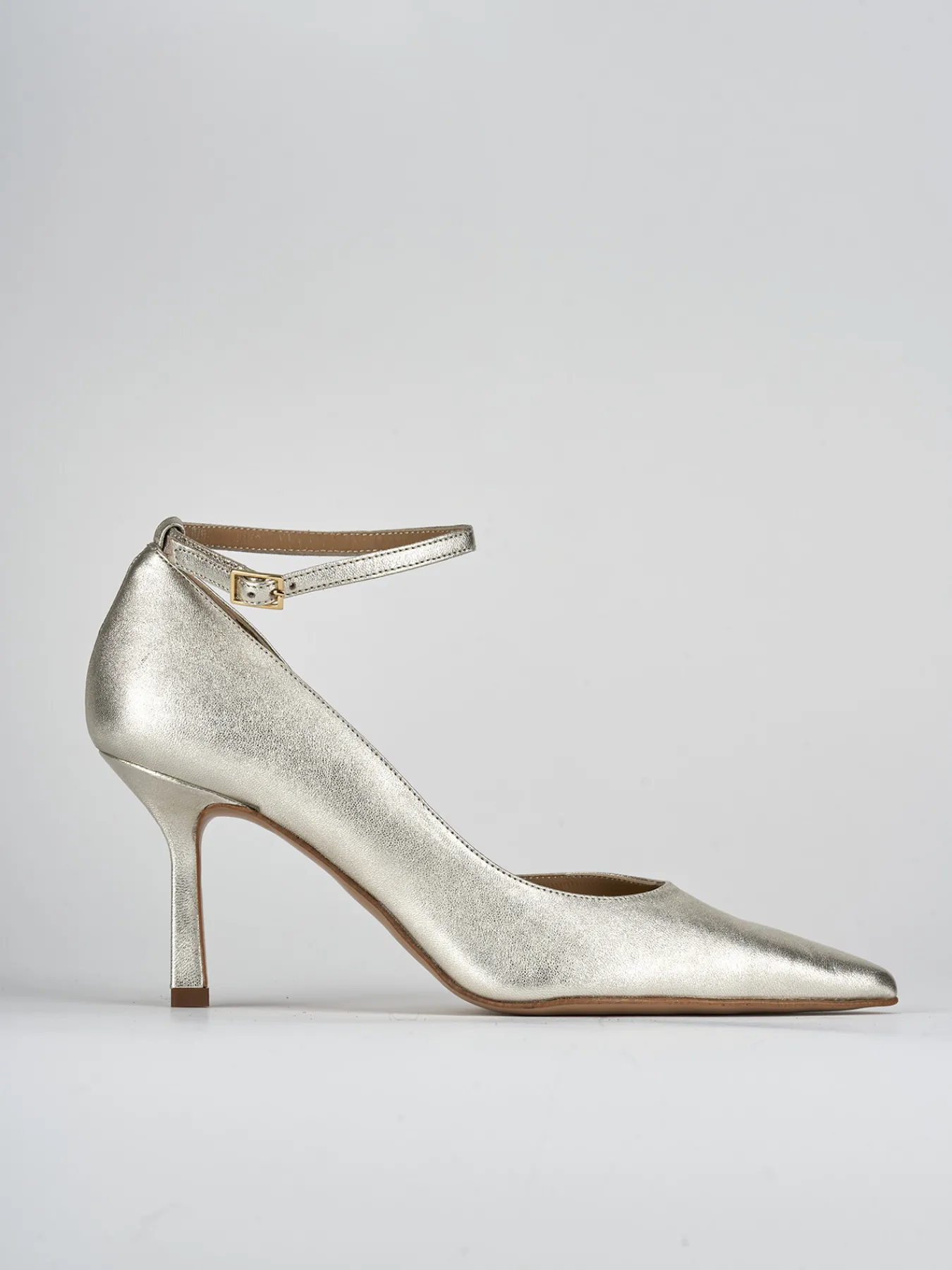 Bebe’ tacco 7 cm fondo in cuoio e soletto interno in vera pelle. Tomaia in morbida pelle nappata, punta sfilata, scollo a ‘U’, lato interno aperto, cinturino in caviglia regolabile e tacco rocchetto per un look cool.