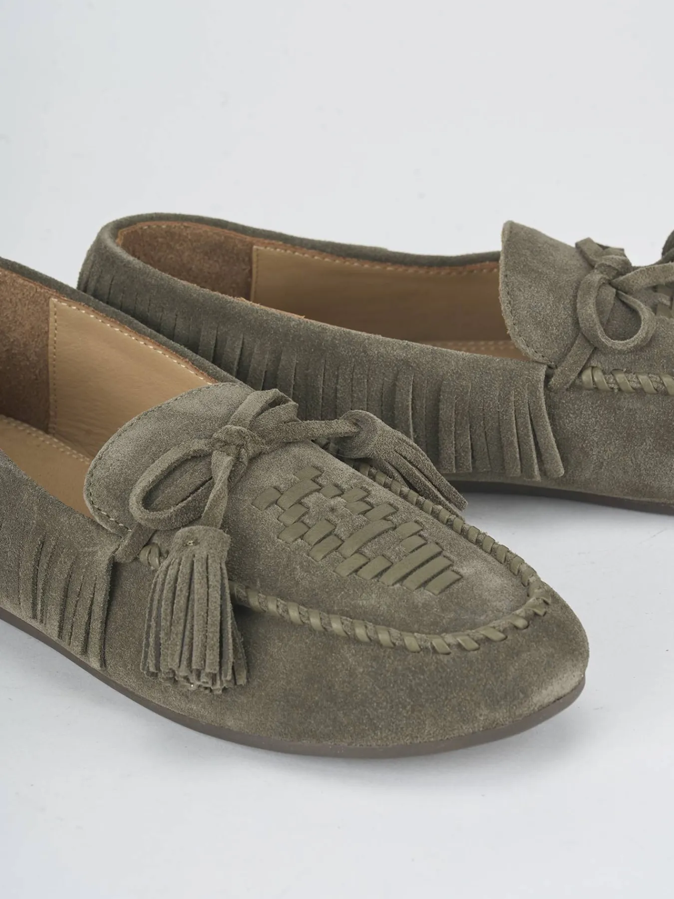 Realizzati in morbido camoscio, questi mocassini presentano dettagli di frange sul bordo superiore, aggiungendo un elemento di stile sofisticato.