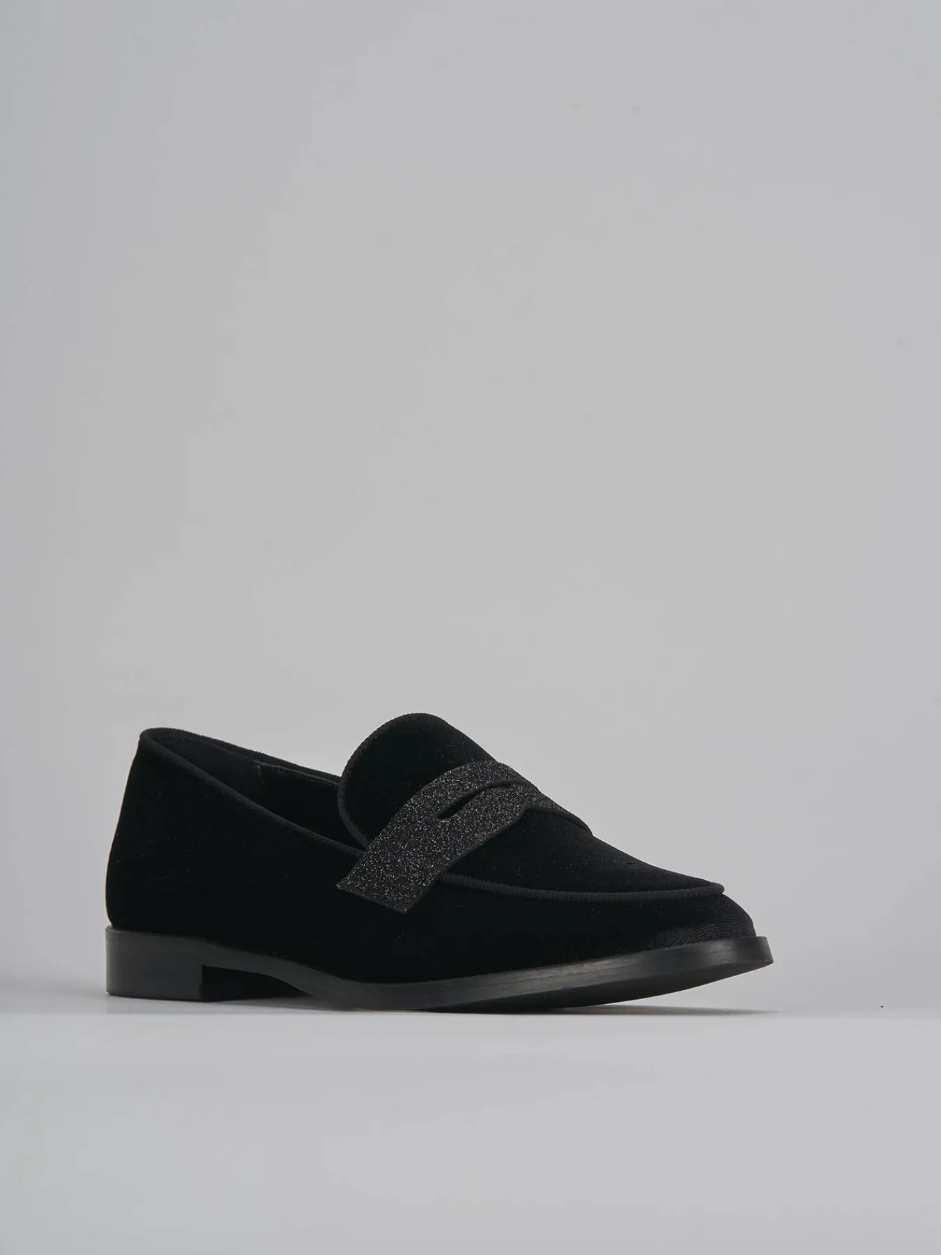 mocassino tacco 2 cm fondo in gomma e soletto interno in vera pelle. tomaia in morbido velluto, punta affusolata, cuciture a vista, mascherina a bocca di leone in pelle glitterata per un tocco fun ai tuoi look.