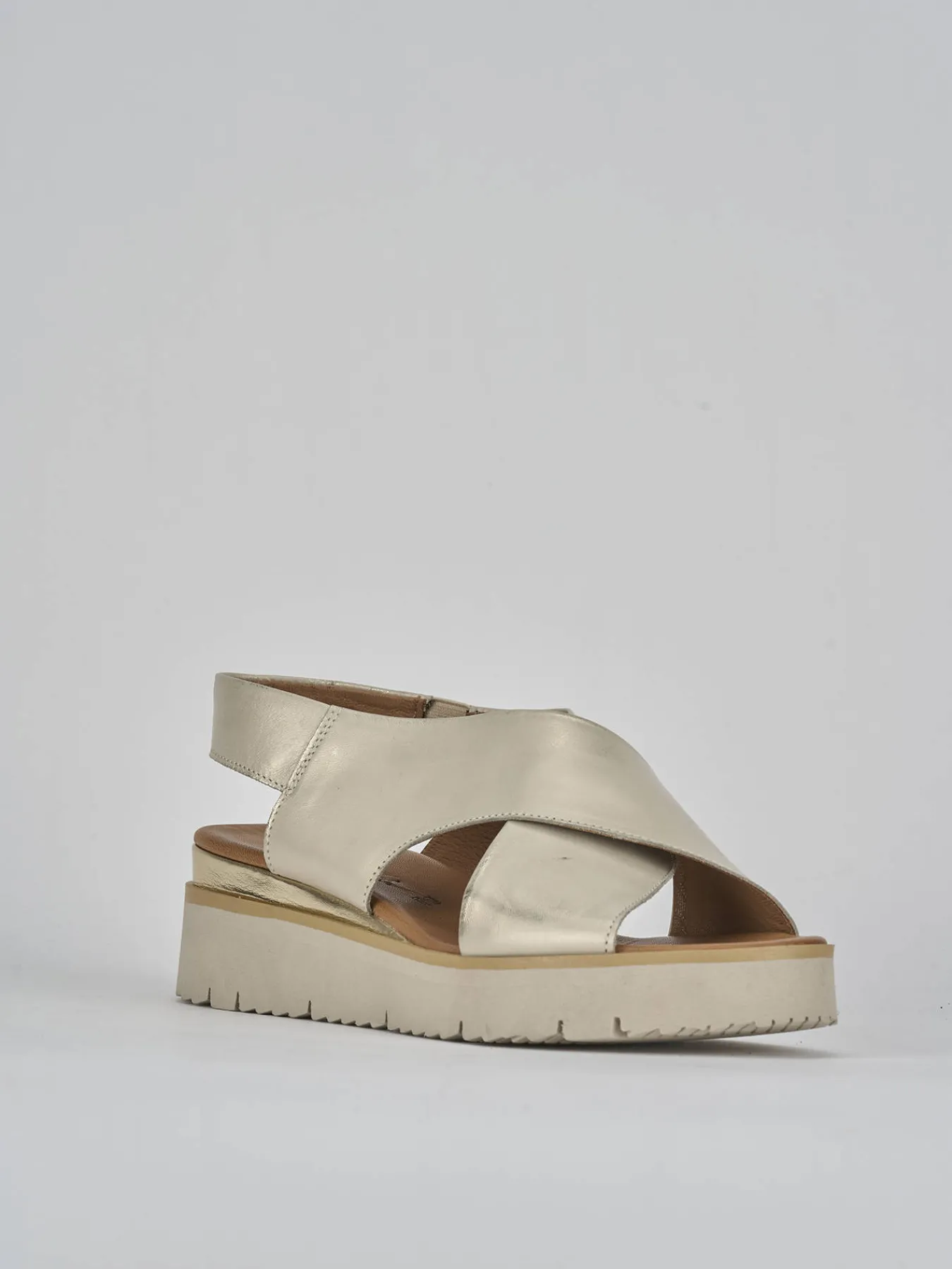 Sandalo zeppa 3 cm fondo in leggerissima gomma e soletto interno in vera pelle. Tomaia in morbida pelle laminata, punta affusolata, fasce incrociate con cinturino elasticizzato per un fit su misura. versatile con qualsiasi tuo outfit.