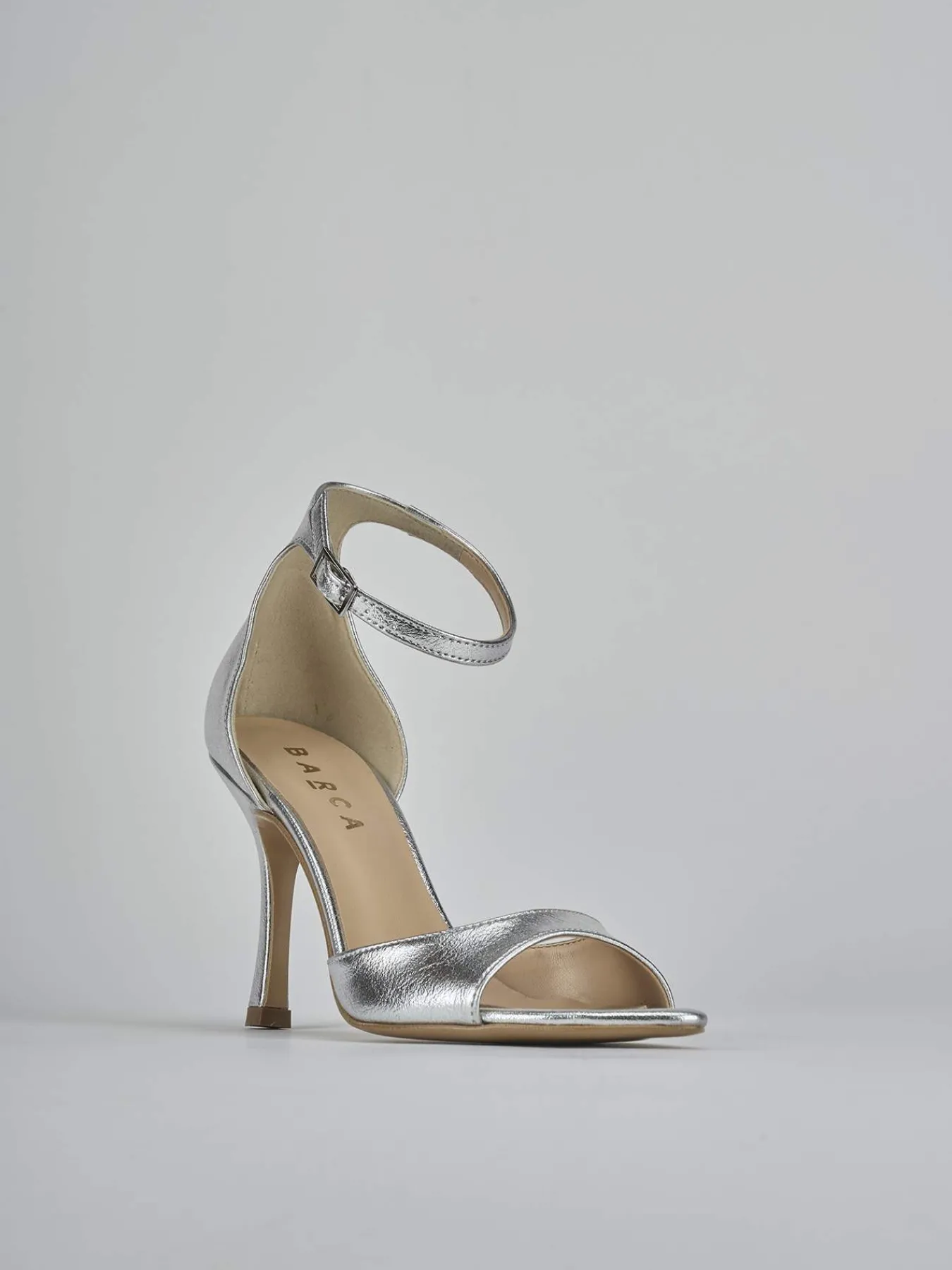 Sandalo tacco 9 cm fondo in leggerissima gomma e soletto interno in vera pelle. Tomaia in morbida pelle laminata, punta sfilata, fascia, cinturino con fibbia regolabile e nuovissimo tacco rocchetto. Dalle linee semplici che durano nel tempo.