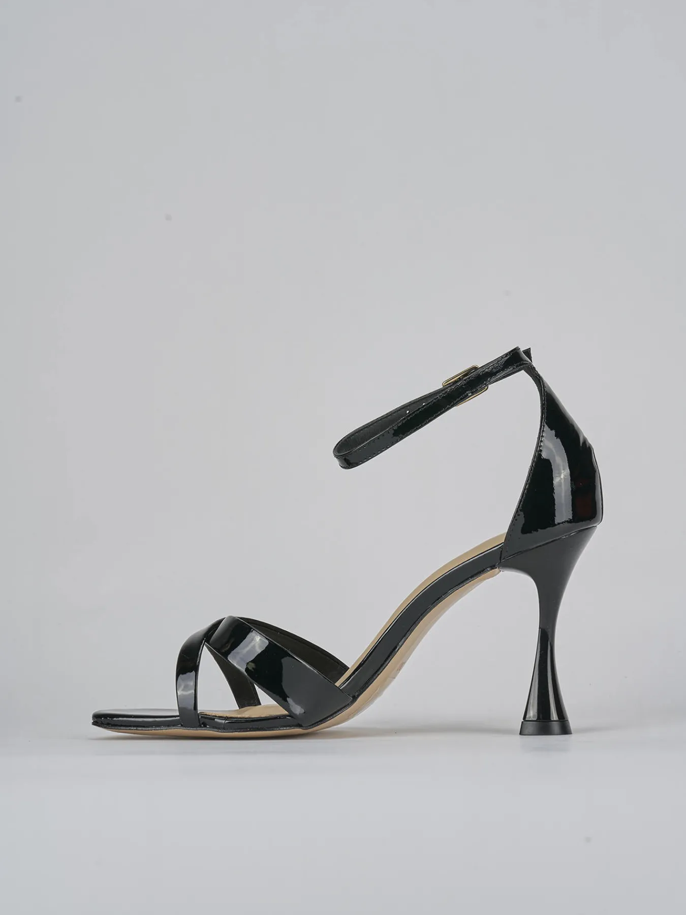 Sandalo tacco 9 cm fondo in leggerissima gomma e soletto interno in vera pelle. tomaia in morbida pelle effetto vernice, punta squadrata, fasce incrociate in punta, tallone chiuso, cinturino regolabile e nuovissimo tacco rocchetto. Perfetto con un pantaloncino corto e una camicia.